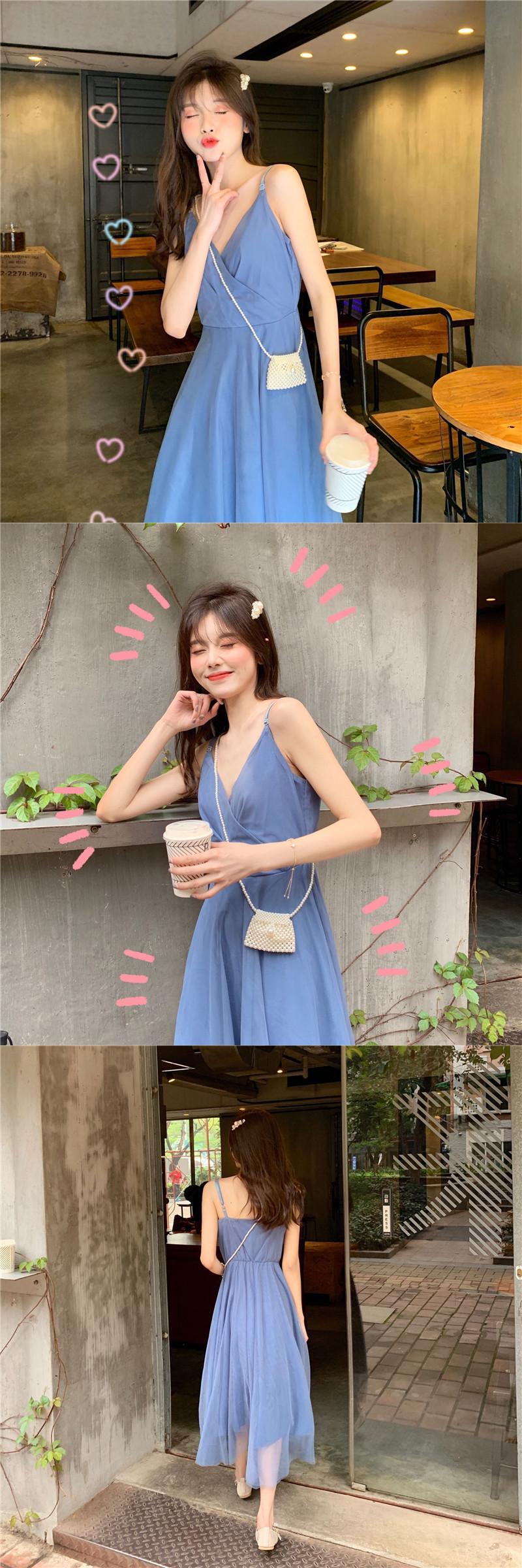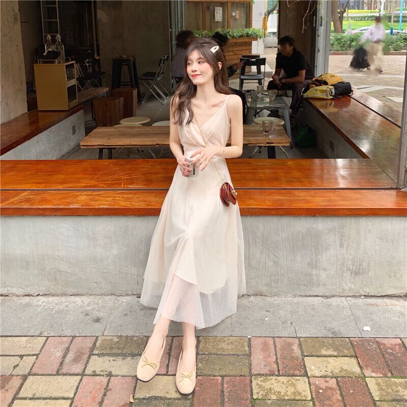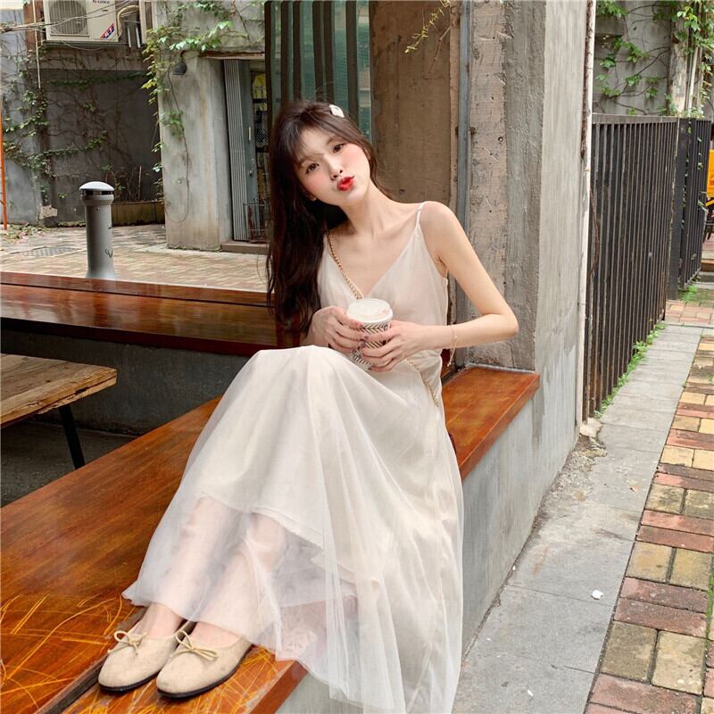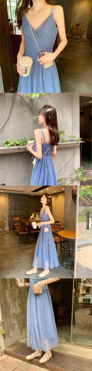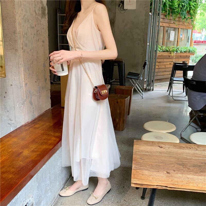 フレンチロングスカート2019夏フレンチニッチメッシュハイウエストVネックウエストサスペンダードレス 1号婦人84535125870