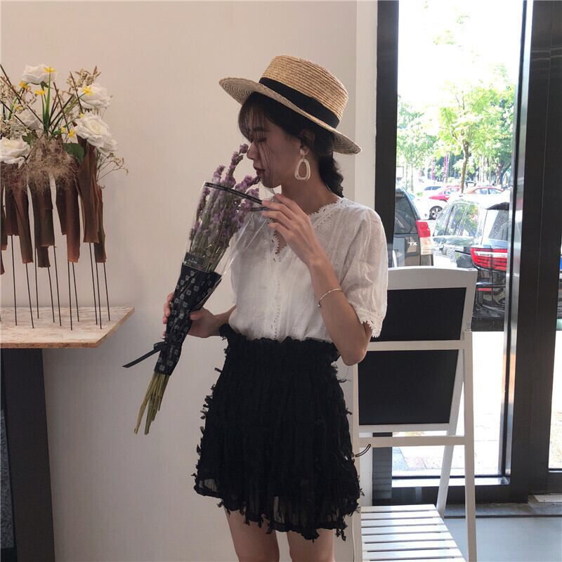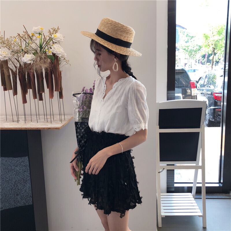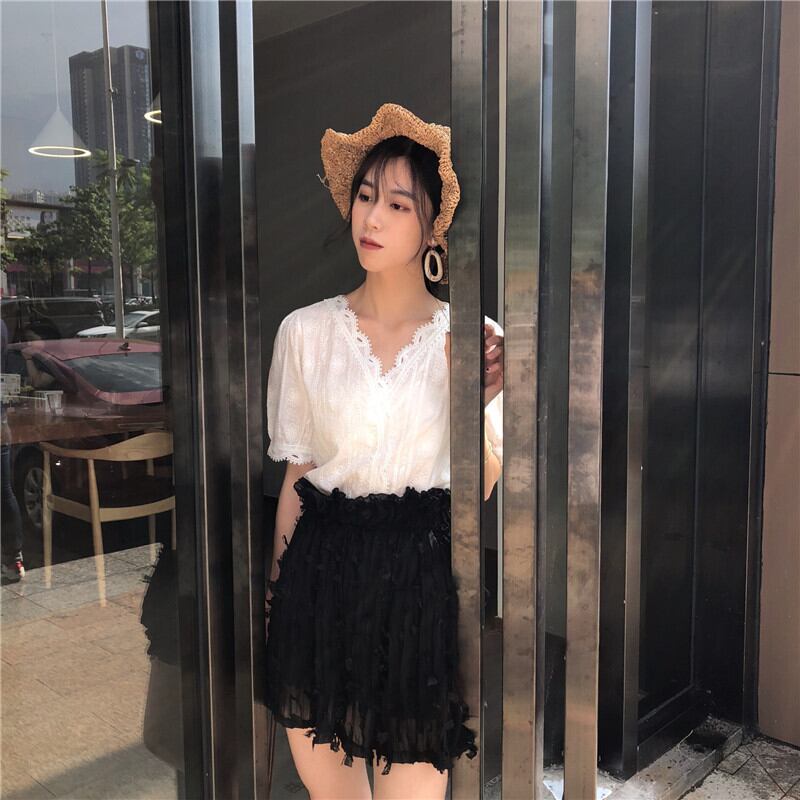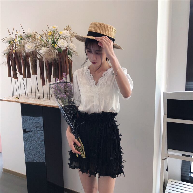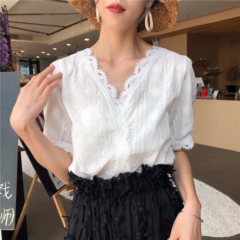 2020年春に新しい女性の白いレース漏れやすい鎖骨Vネック中空西洋風ブラウス気質半袖シフォンシャツ 1号婦人11915779711