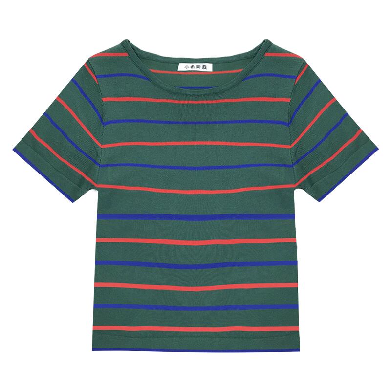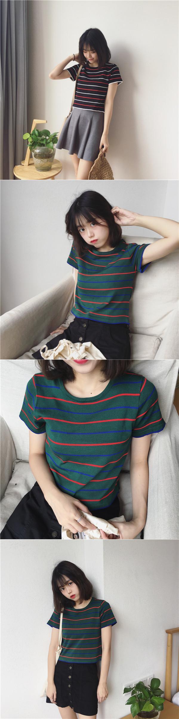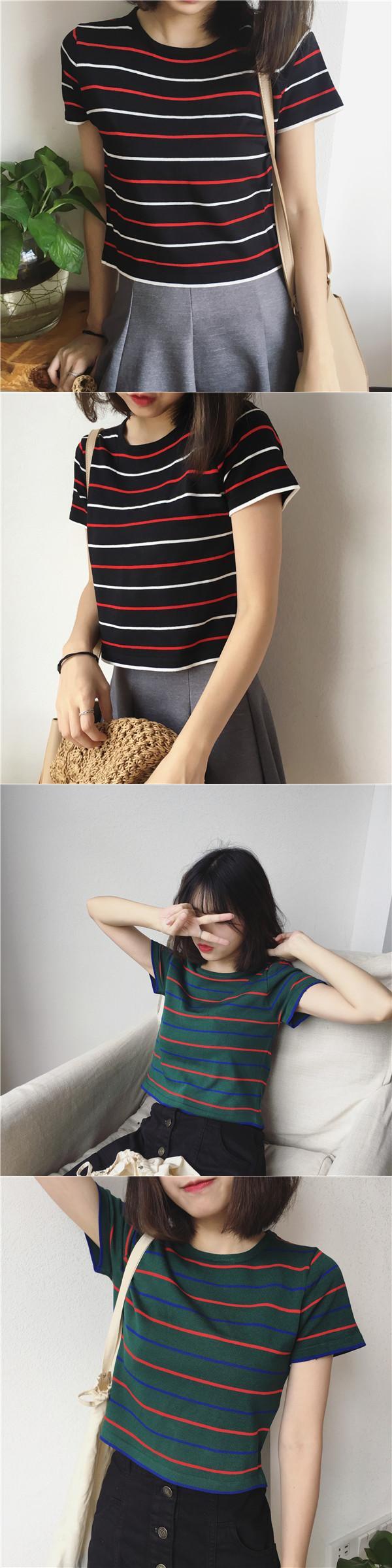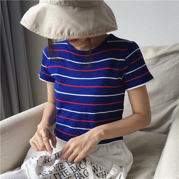 春先の新しい女性のラウンドネックショートカラーマッチングストライプストレッチタイトボディシャツ学生半袖Tシャツトップ 1号婦人89928777114