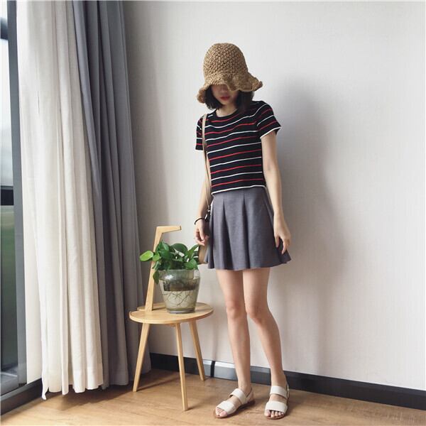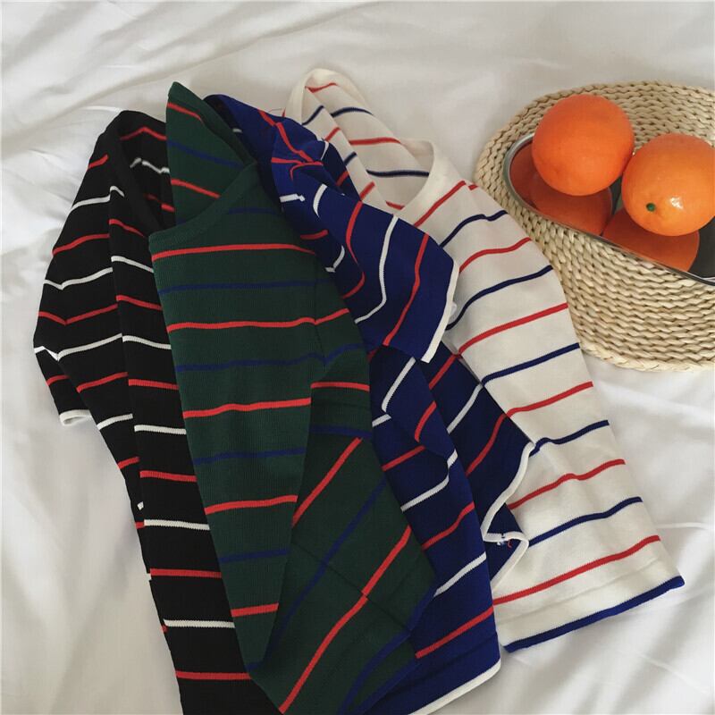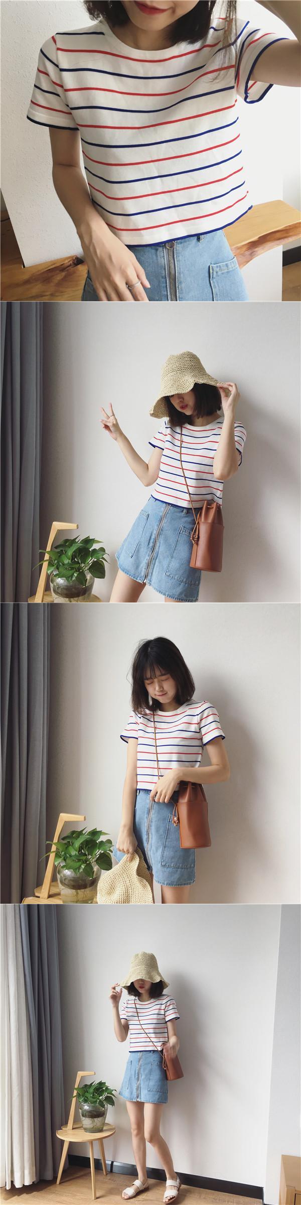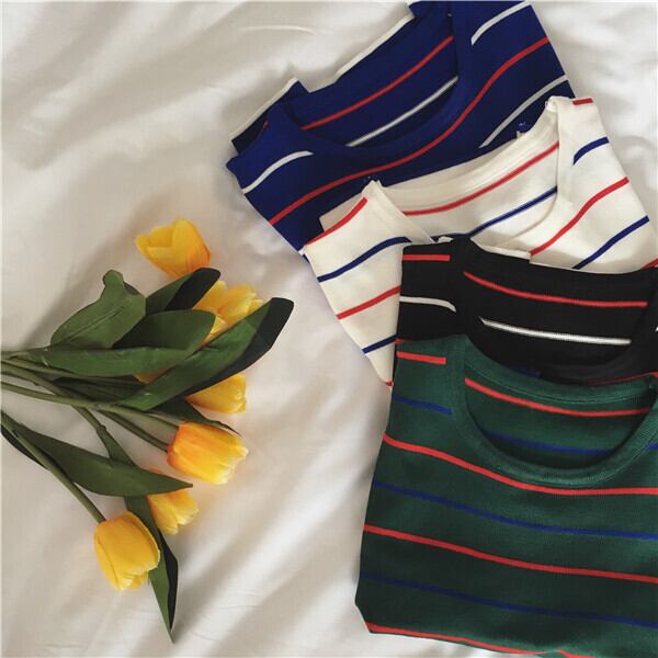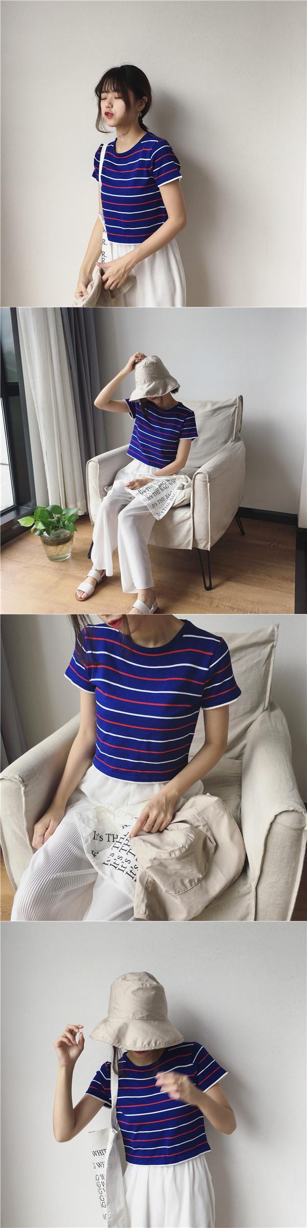 春先の新しい女性のラウンドネックショートカラーマッチングストライプストレッチタイトボディシャツ学生半袖Tシャツトップ 1号婦人89928777114