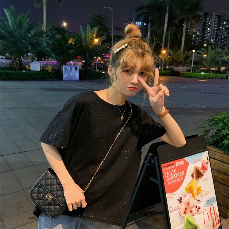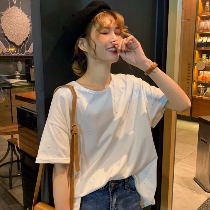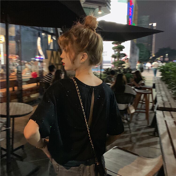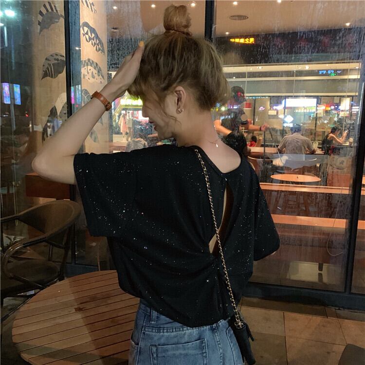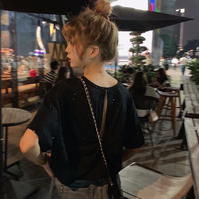 バージョンのバック中空と結び目の無地の野生の輝くTシャツ底入れシャツ女性の夏の新しい半袖白のトップの服 1号婦人23258133185