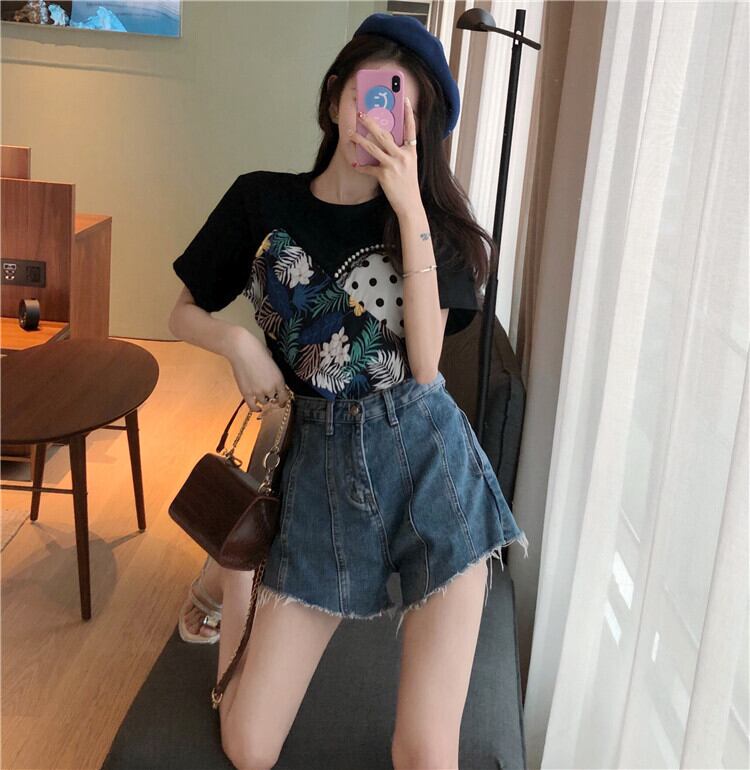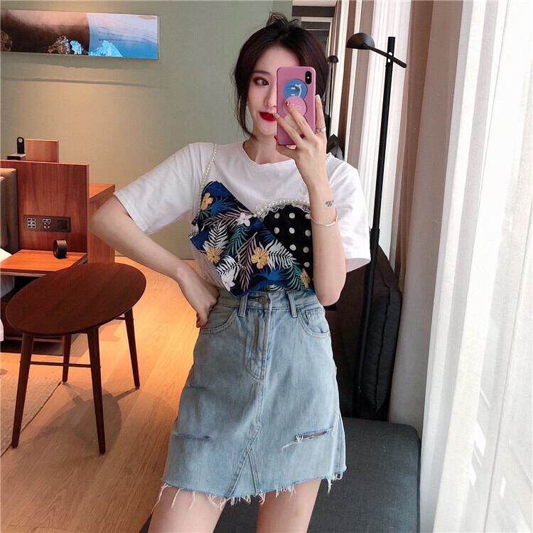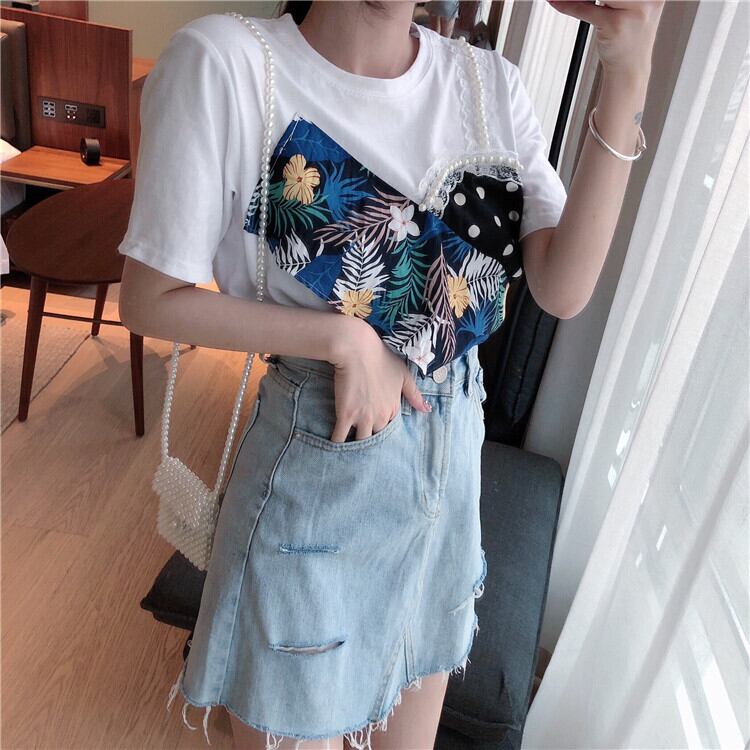 女性の夏2020新しい波ポイントデザイン感覚印刷ステッチ半袖ルーズフェイクツーピースホワイトTシャツトップ 1号婦人20621579809