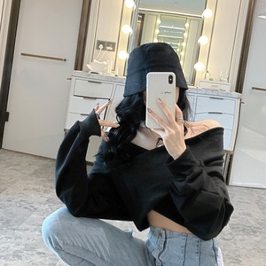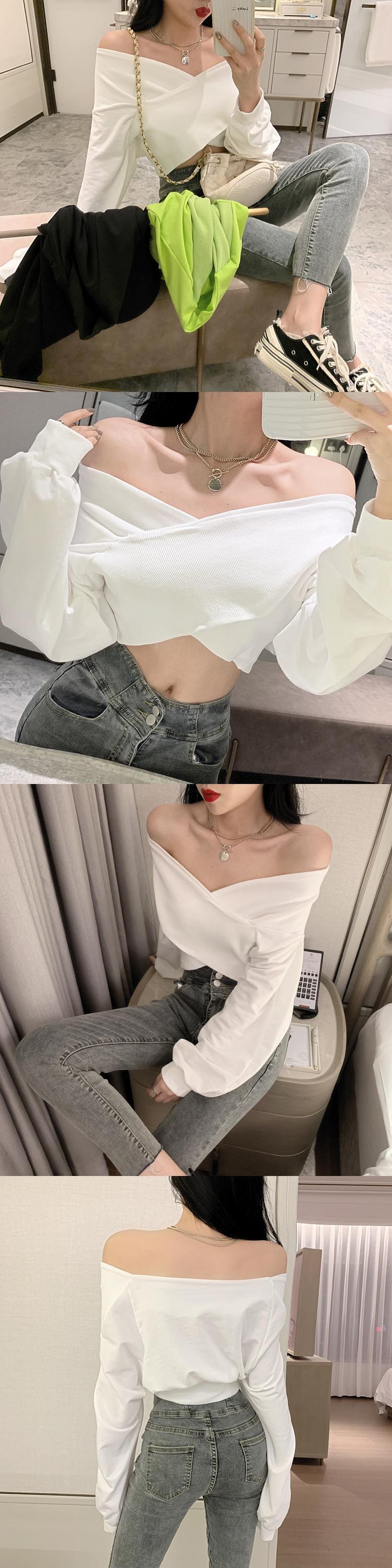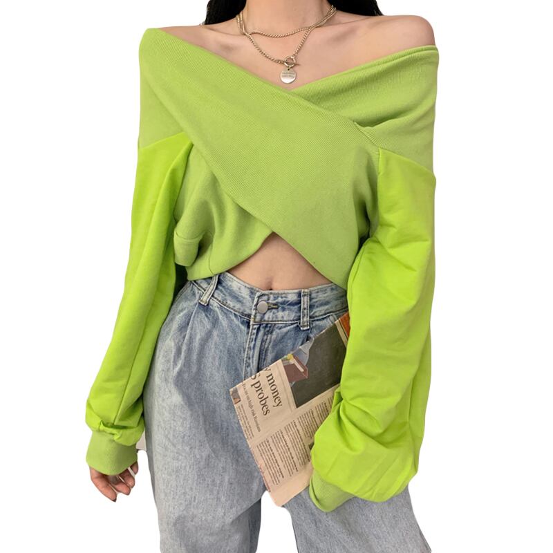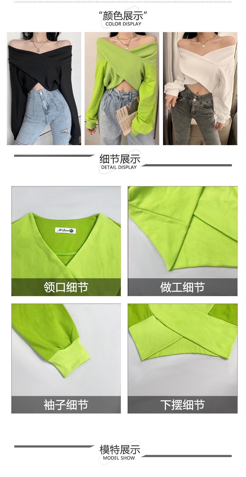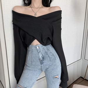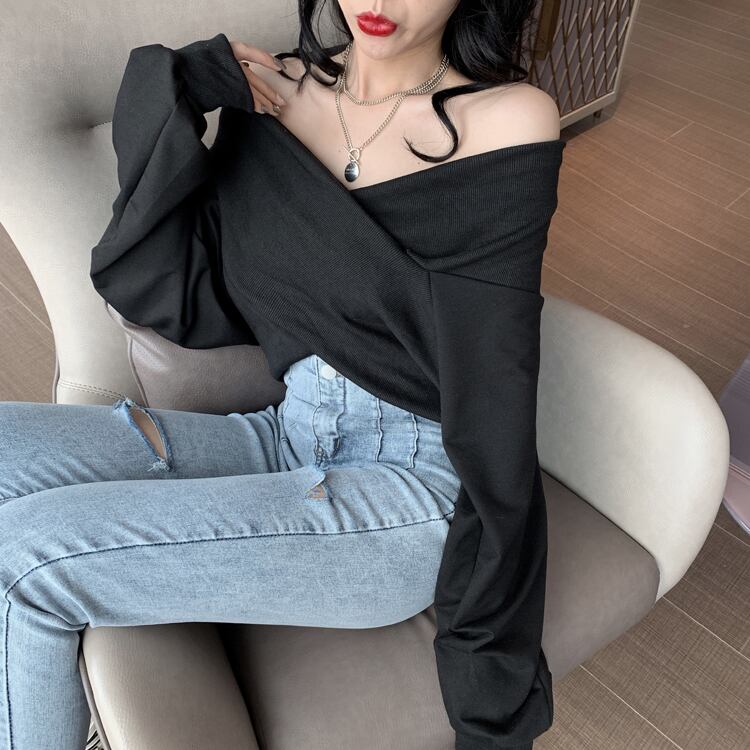女性の秋の服2019新しいトレンディなセクシーなクロスオーバー大きなVネックオフショルダーデザインニッチルーズ長袖Tシャツトップ 1号婦人5831477953