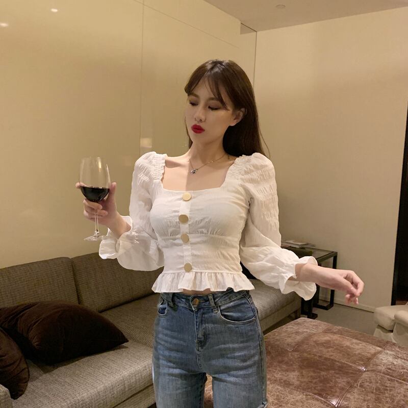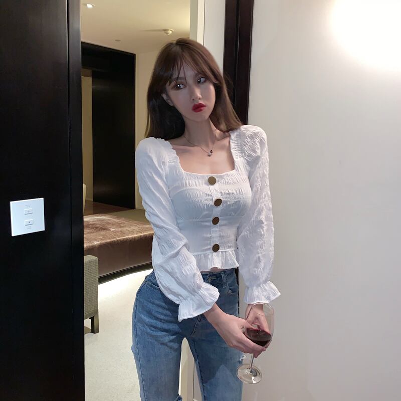 レディースシャツデザインニッチ2020ニューオータムエインスタイルフォールドスクエアカラーホワイトスリム長袖トップス 1号婦人27344044237