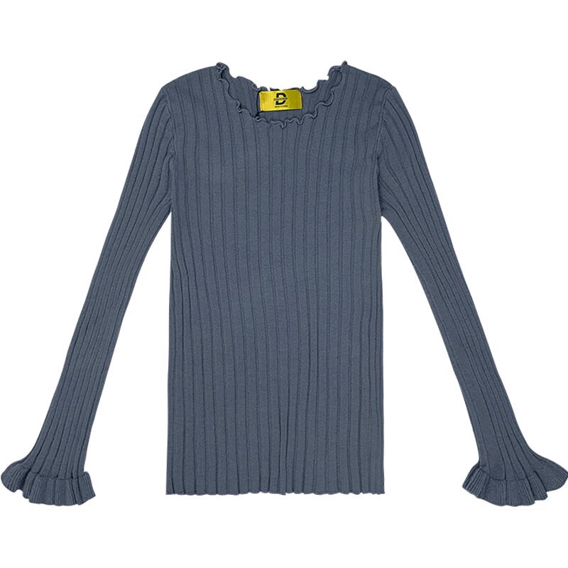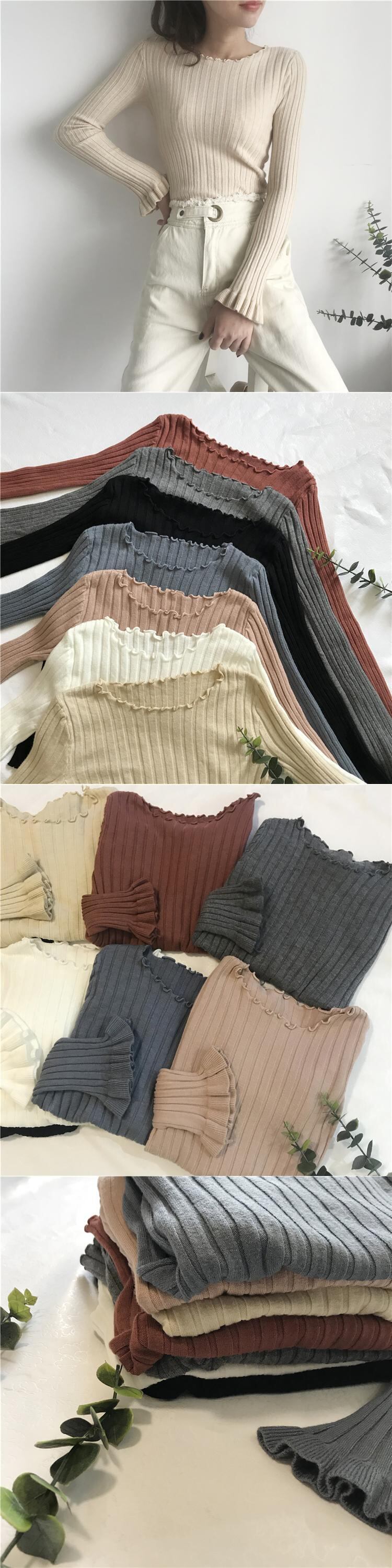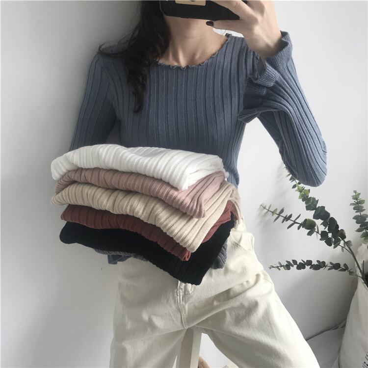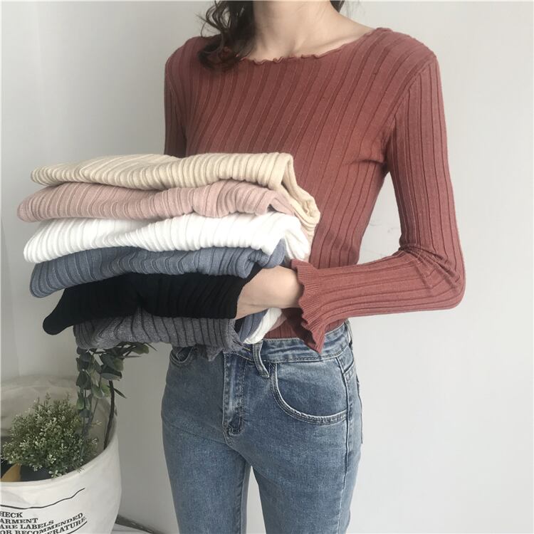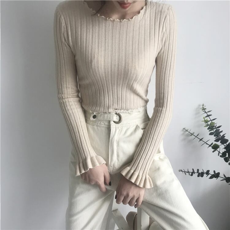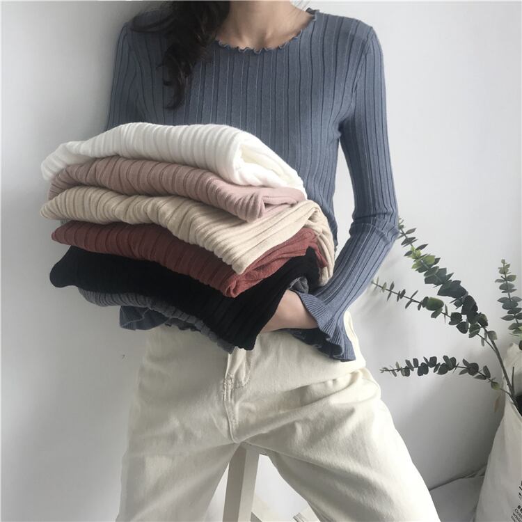 秋冬ウィメンズスタイルスリムラウンドネックセーター、木製耳付き無地タイトフィットトランペットスリーブセーターベース 1号婦人62397729833