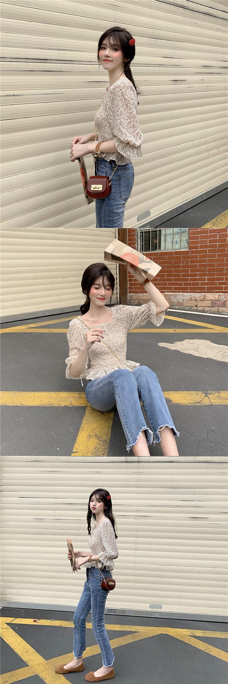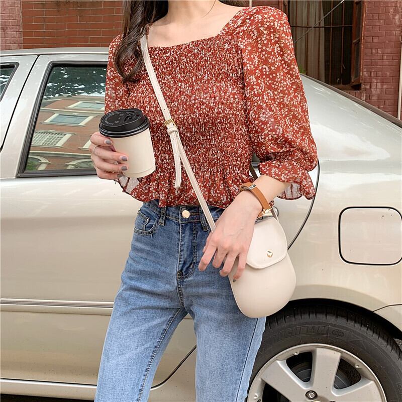 スリムスリミングスクエアネックシフォンシャツレディース2020初春新作気質オールマッチフローラルショートトップ 1号婦人92424027560