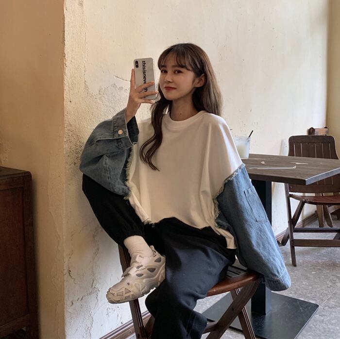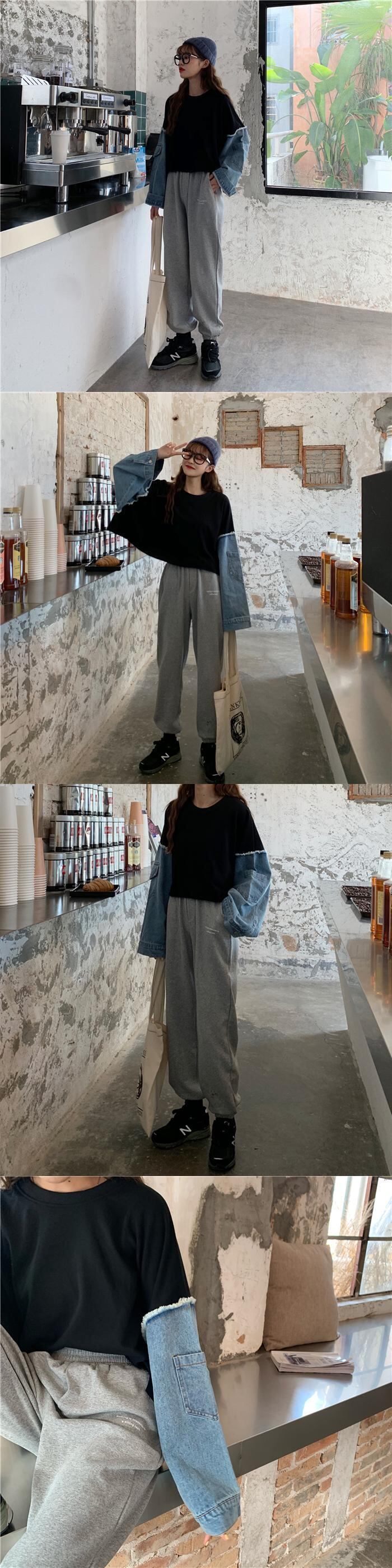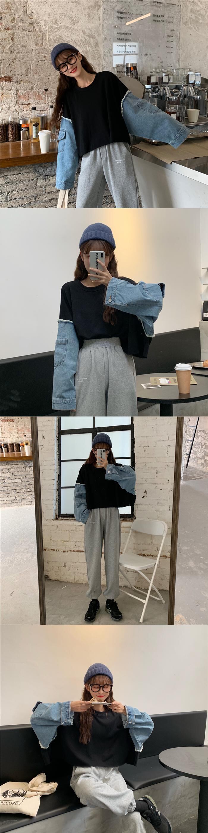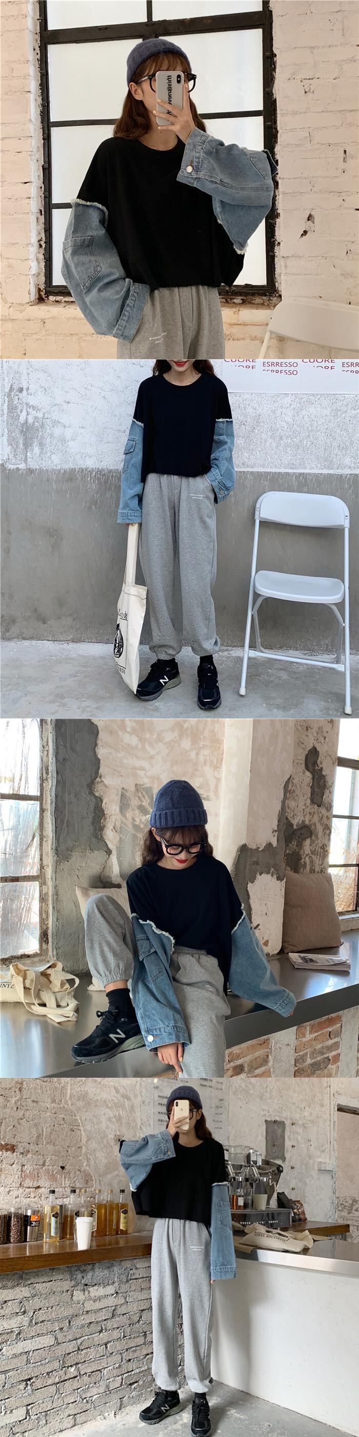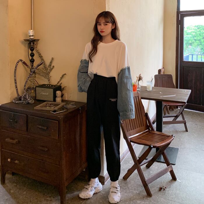 色:ホワイトスペルトデニムスリーブ,ブラックスペルデニムスリーブ,黒いズボン,グレーのズボン