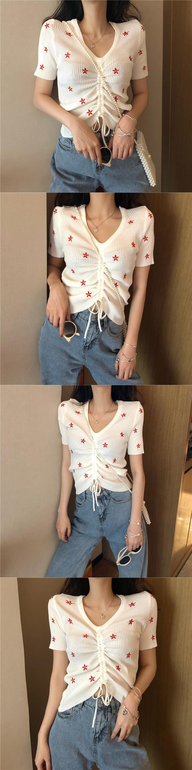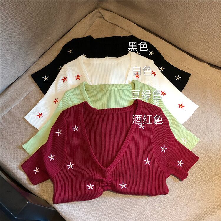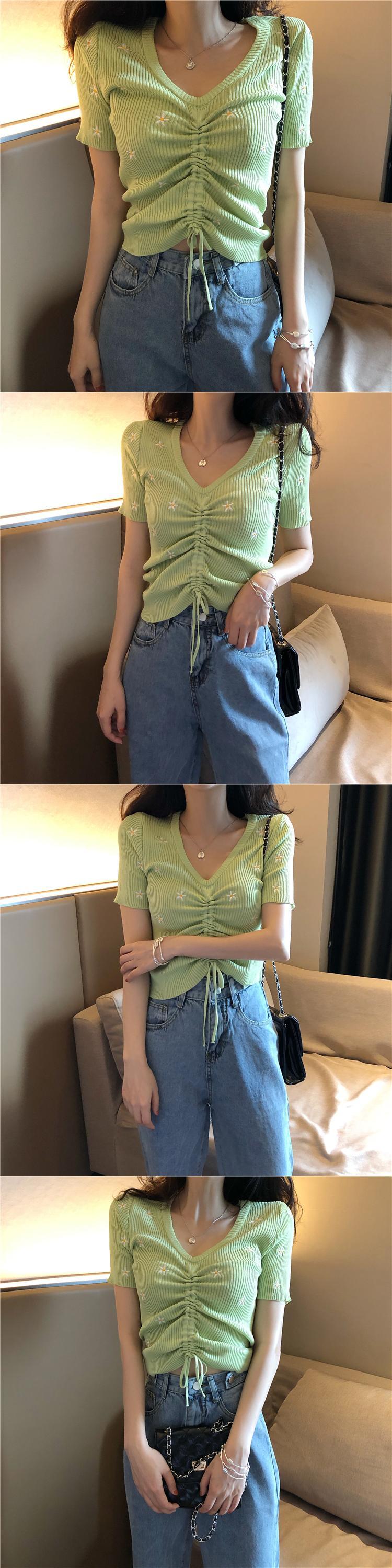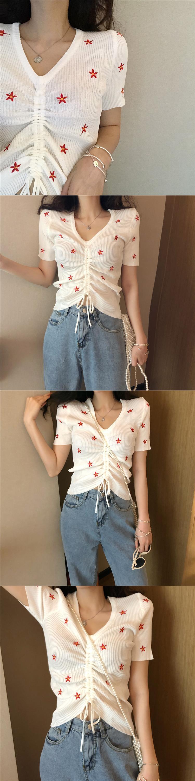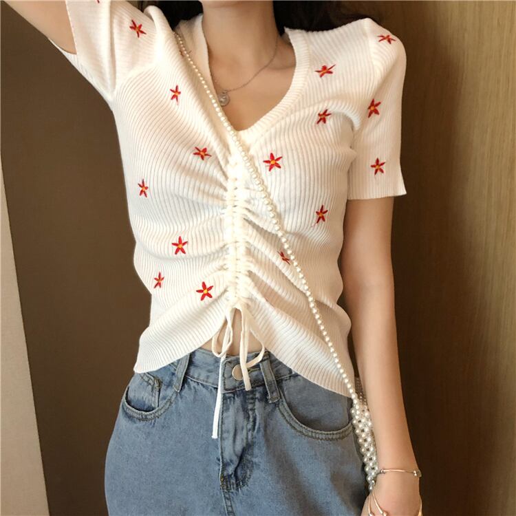 ニットセーターレディース2020年初春新流行刺繍小花半袖セクシーVネック巾着Tシャツボトミングトップ 1号婦人80817563957