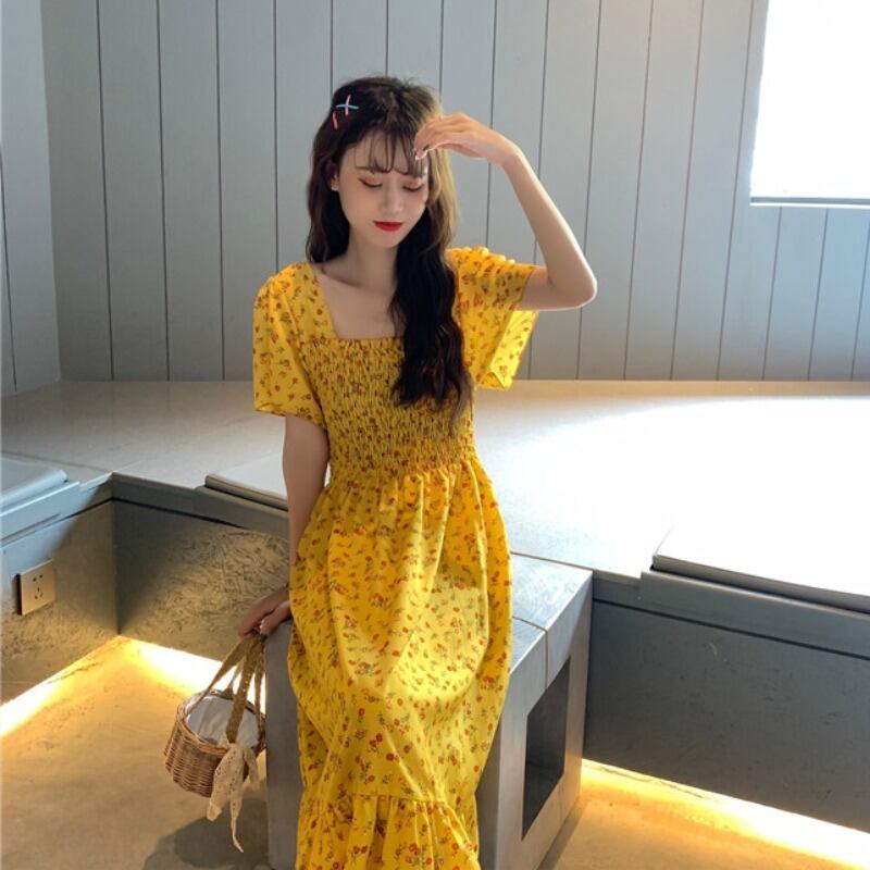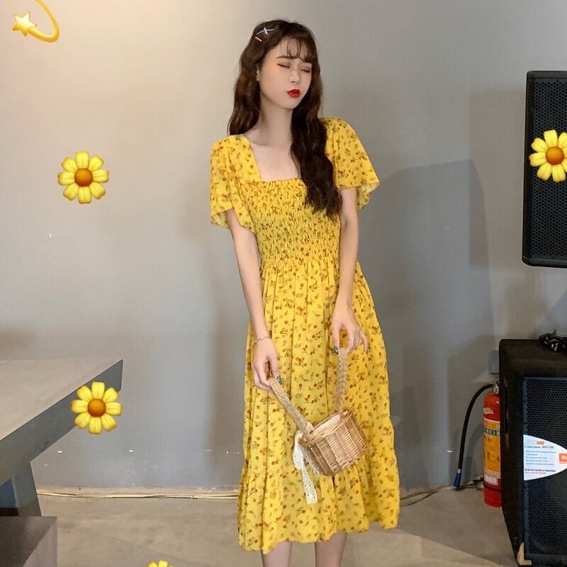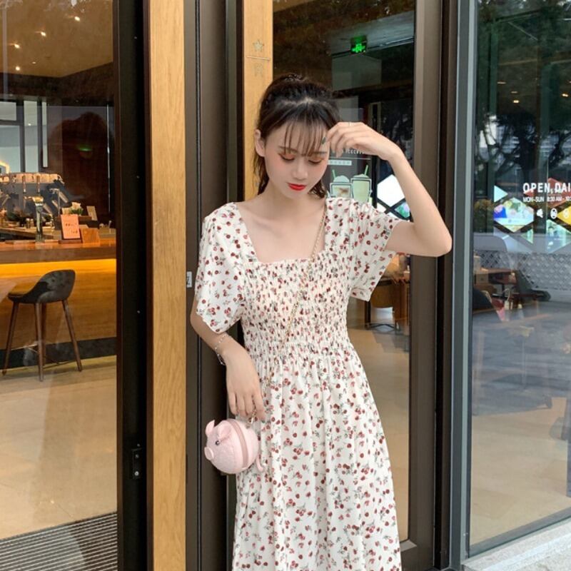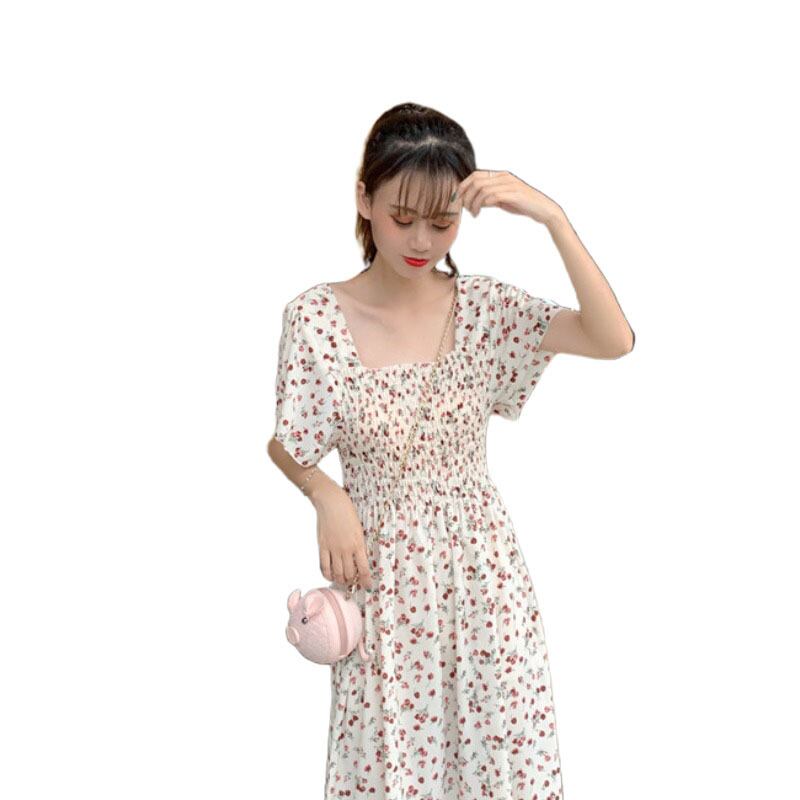 2020年初春の新しいレトロな香港フレーバーワイルドミドル丈Aラインスカートスクエアネックフローラルシフォンフリルドレス女性 1号婦人73917335376
