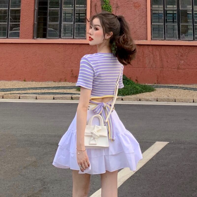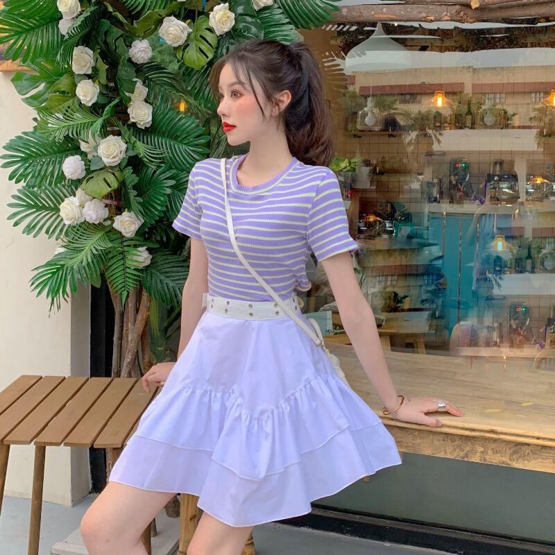 薄手のフリルウエストハーフレングスショートスカート2020年春夏ツーピーススーツストライプ半袖Tシャツレディース 1号婦人88442937859