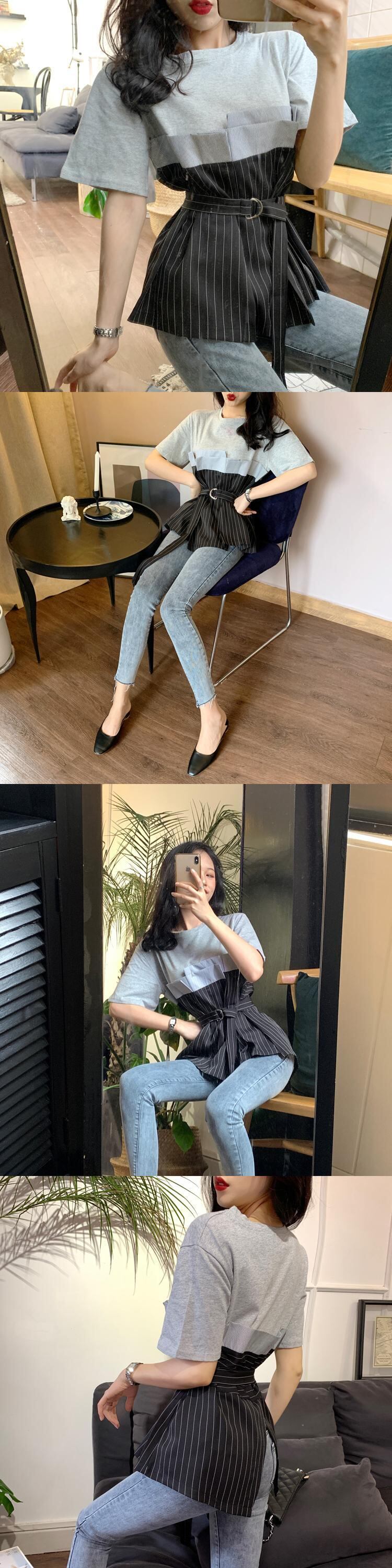 2020年春の新しいカジュアルストライプステッチフェイクツーピーストップスウエストパッチオールマッチ半袖Tシャツ女性 1号婦人74124904888