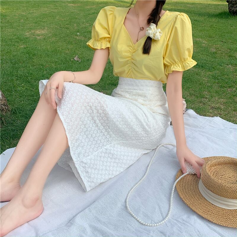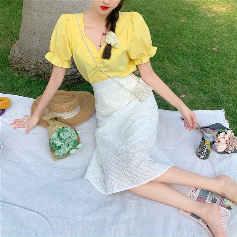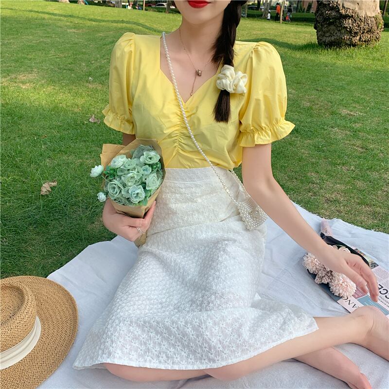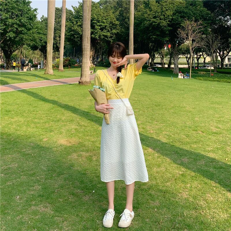 2020年夏の新作スーツエインスタイルVネックバブル半袖シャツトップハイウエストジャカードホワイトAラインスカート 1号婦人429542213