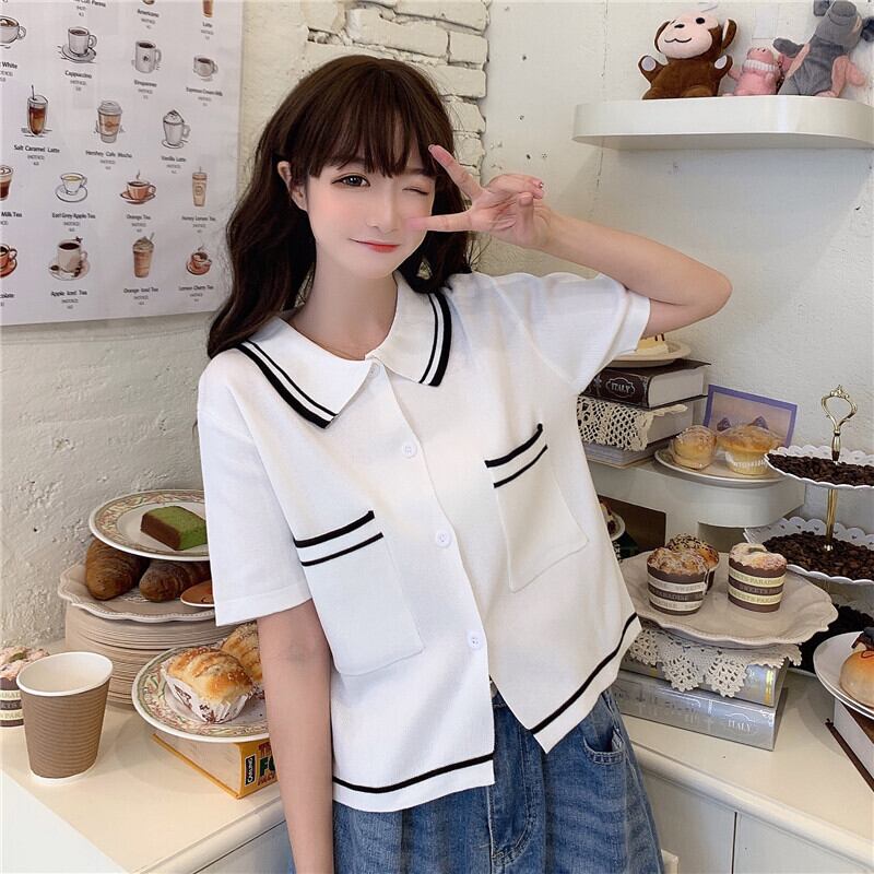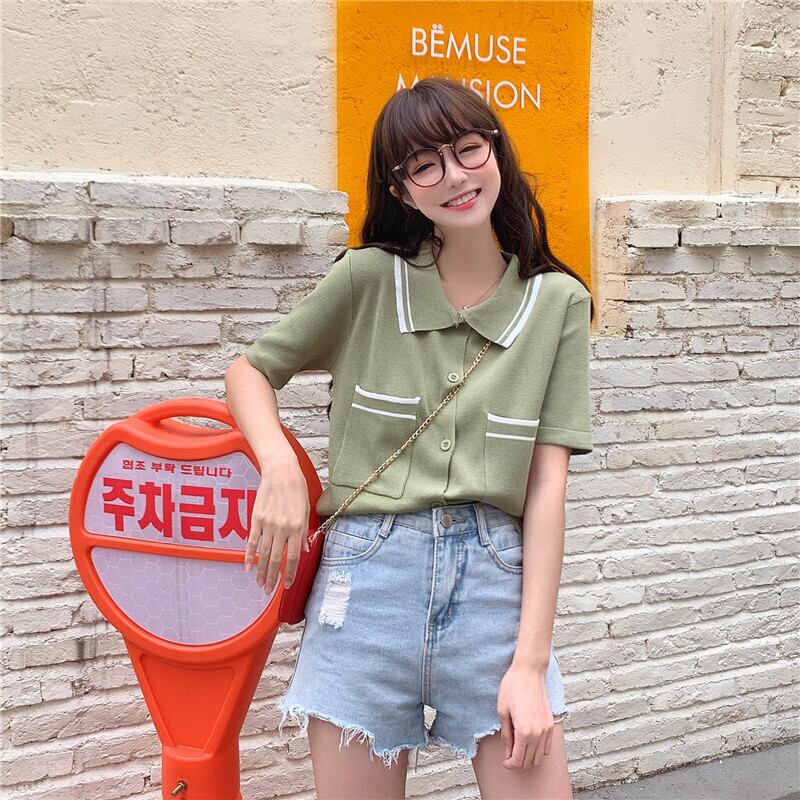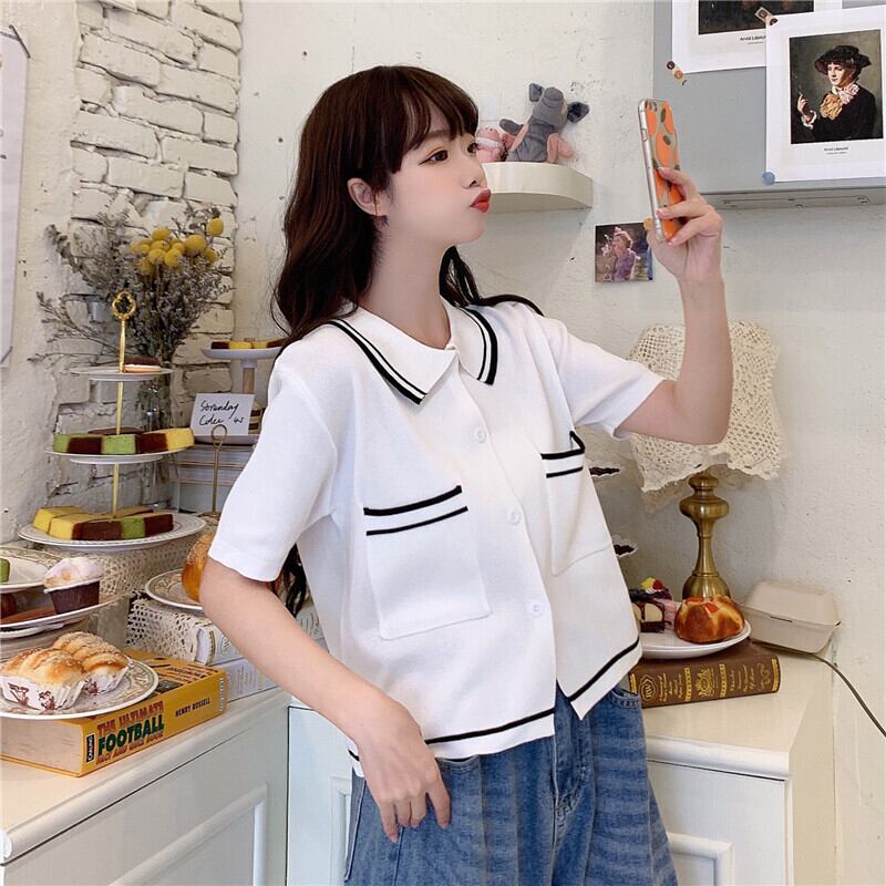 ニットウェア2020夏の新しい女性のルーズで薄いポロカラーカーディガンカレッジスタイルのファッションカラーマッチング服 1号婦人8674556650