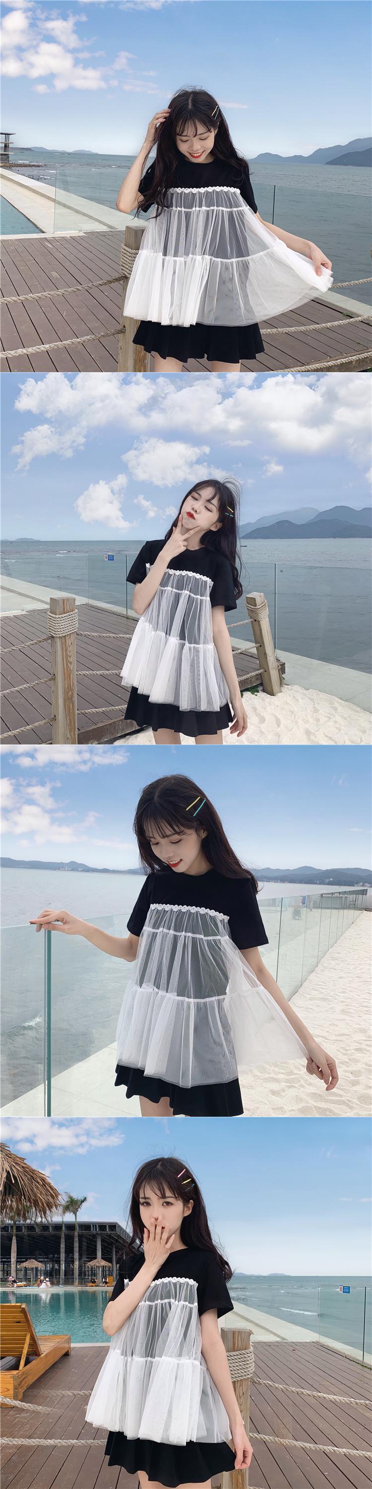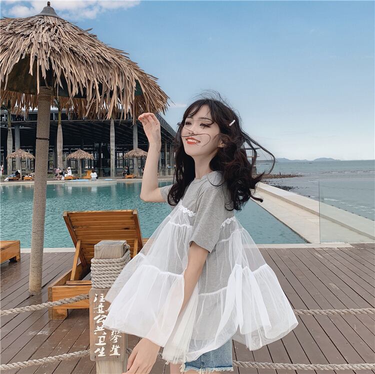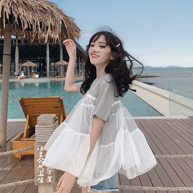 スタイルインスーパーファイヤーネットレッド半袖Tシャツレディース2020新バージョンのスイートメッシュステッチラウンドネックトップ 1号婦人6434412590