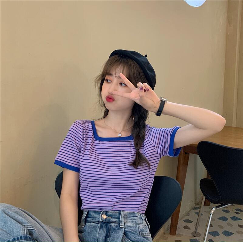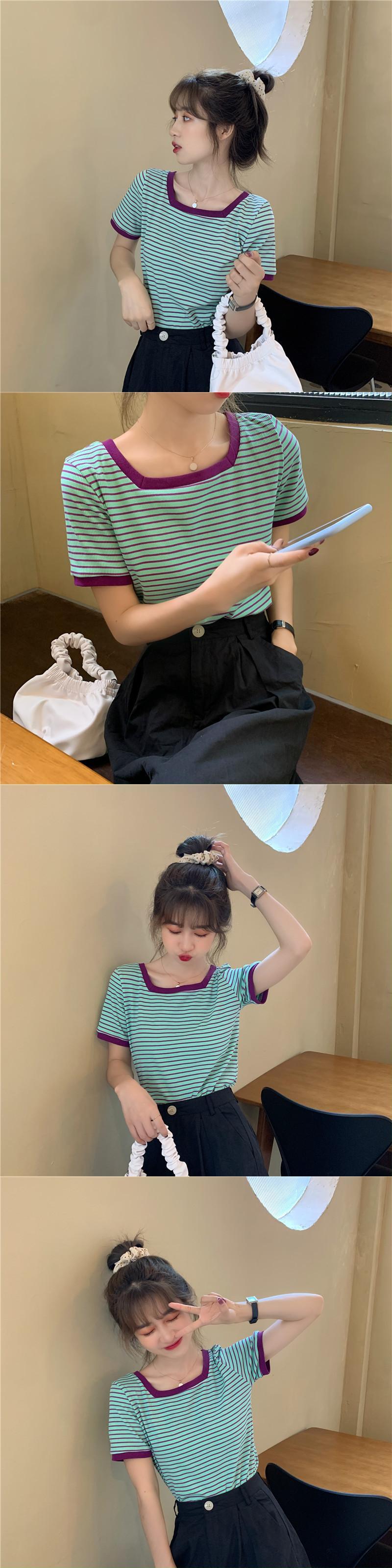 半袖2020新しいストライプTシャツレディースサマードレスインタイドネットレッドスーパーレディースバージョンのスクエアカラースリムボディドレス 1号婦人84605668871