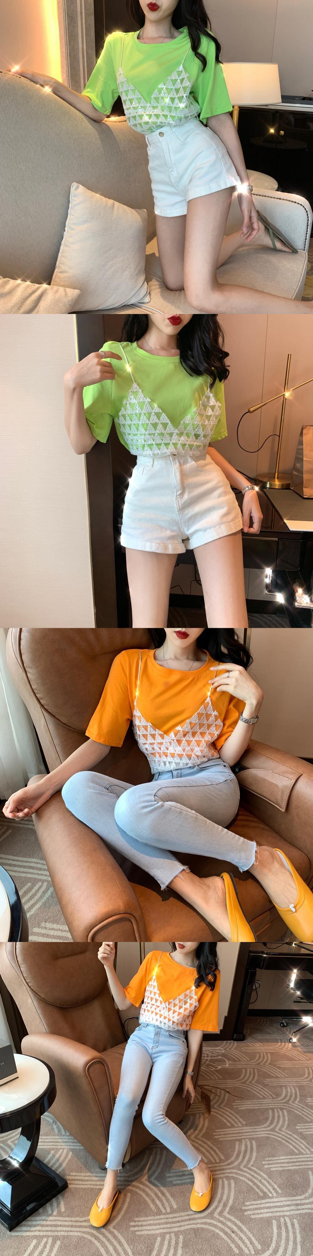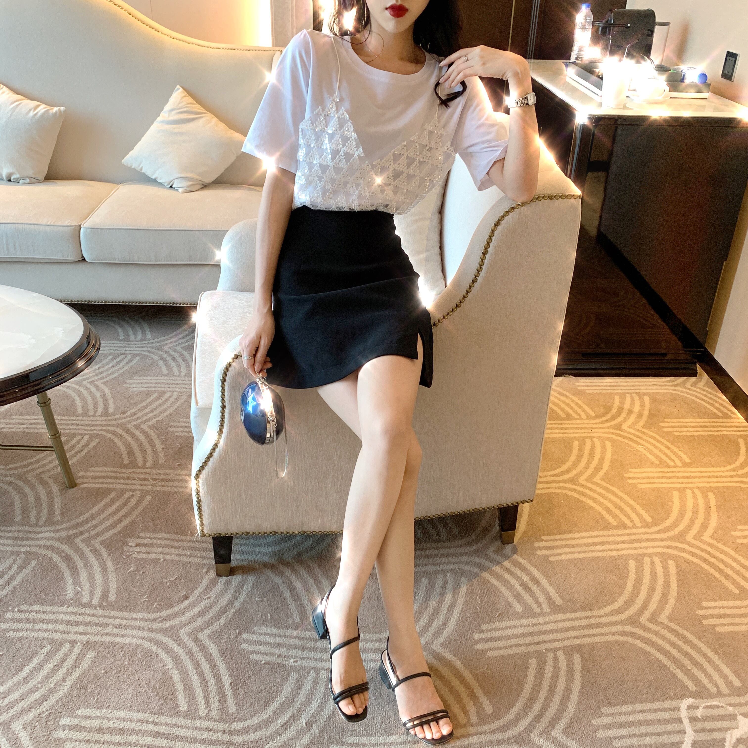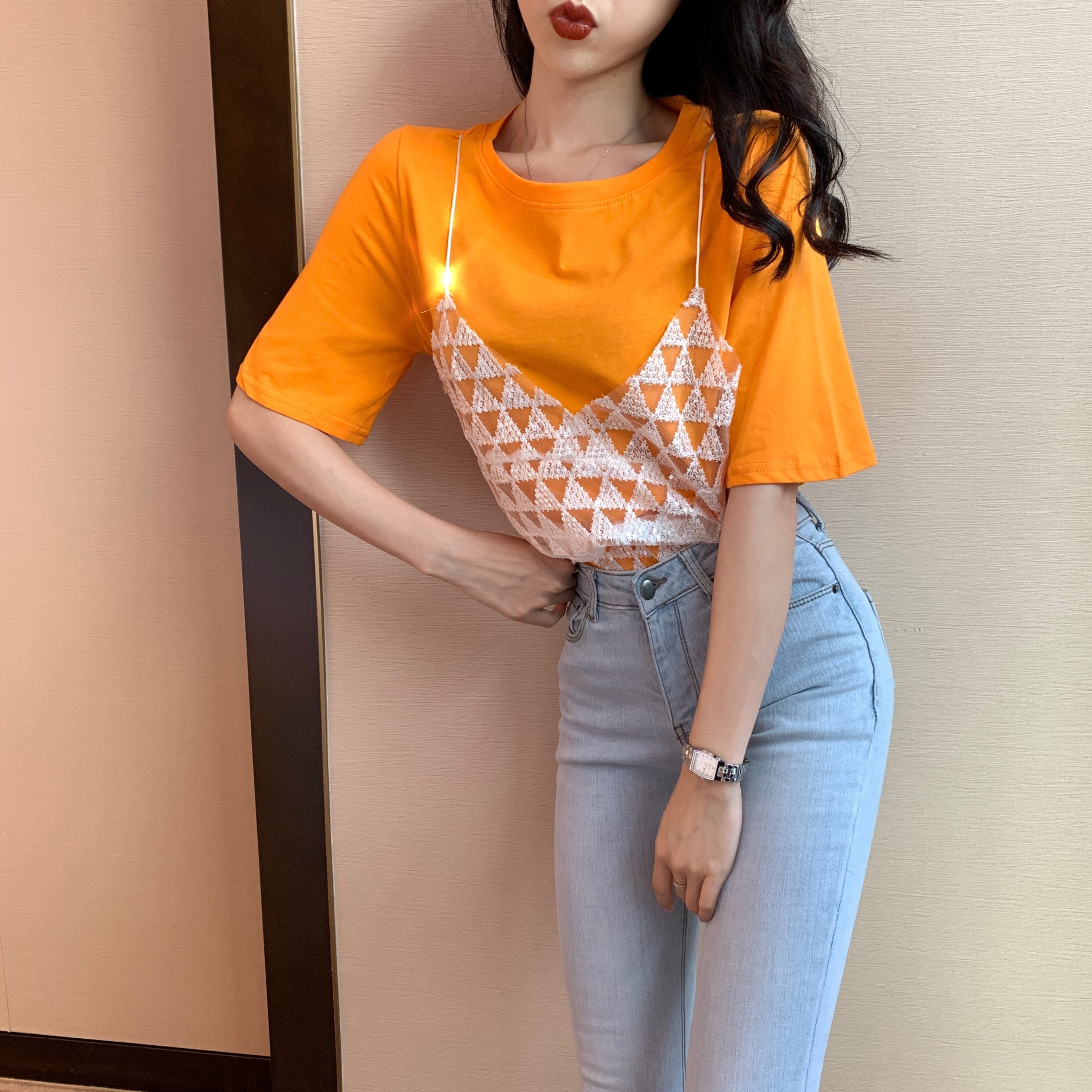 偽のツーピース半袖Tシャツ女性の2020年夏の新しいメッシュスパンコールネット赤白ボトミングシャツトップタイド 1号婦人58368121830