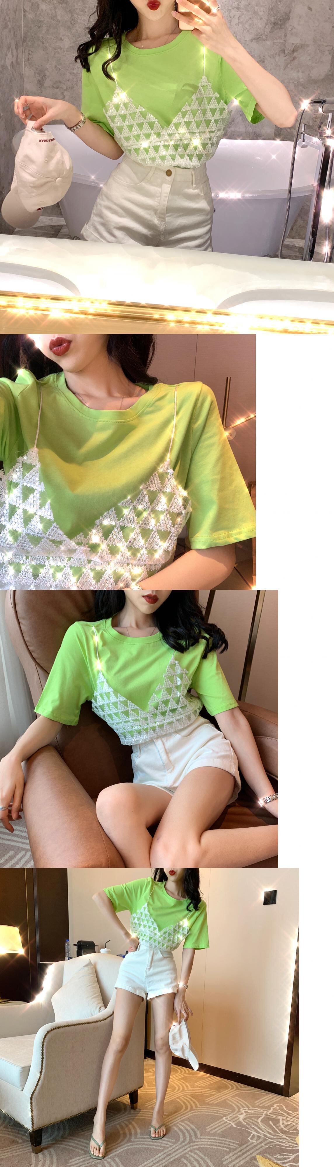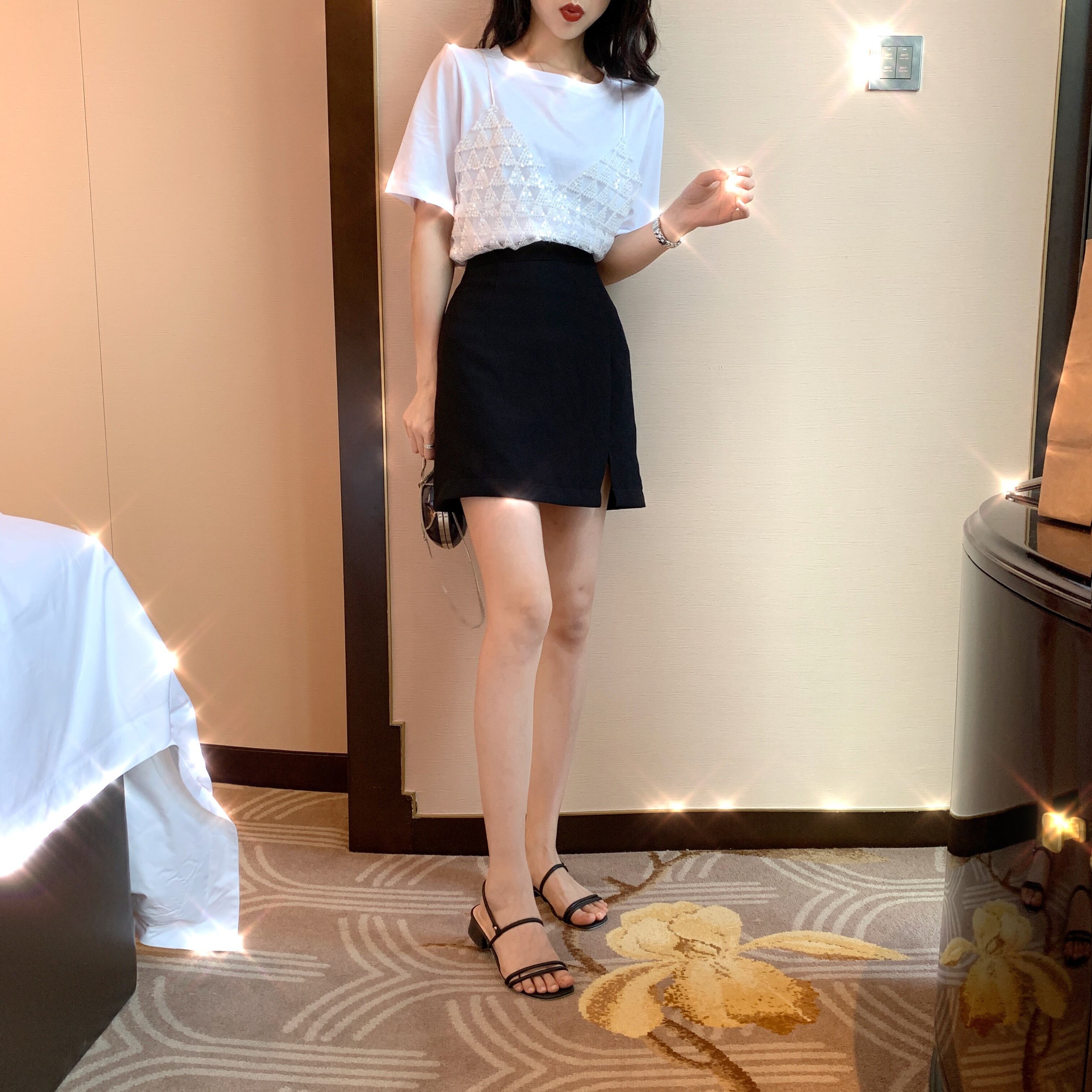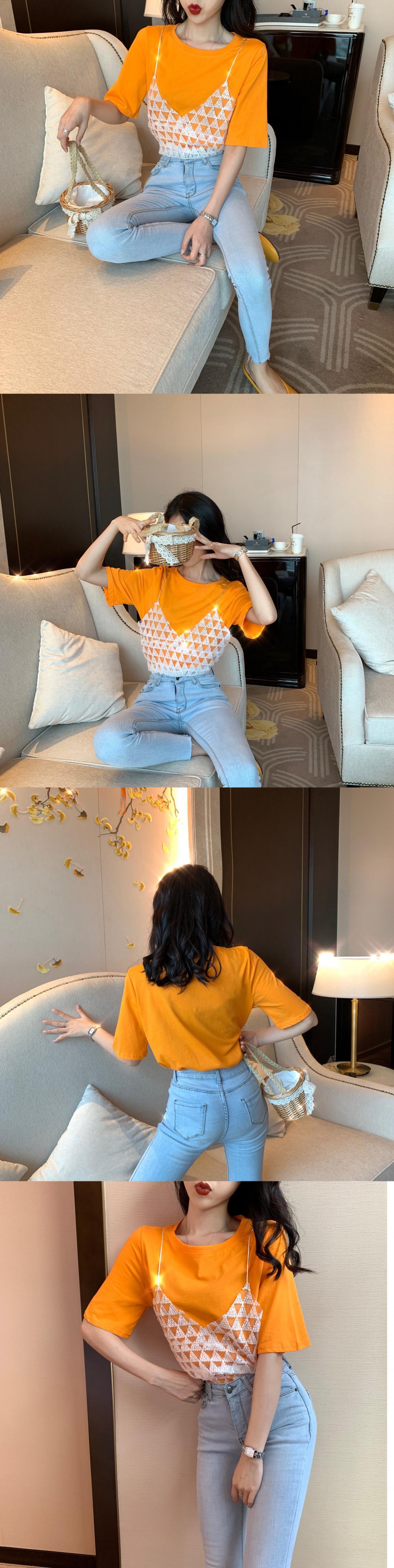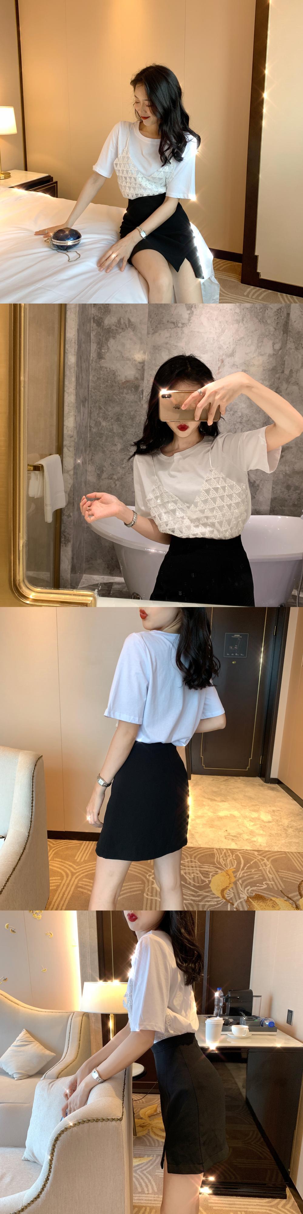 偽のツーピース半袖Tシャツ女性の2020年夏の新しいメッシュスパンコールネット赤白ボトミングシャツトップタイド 1号婦人58368121830