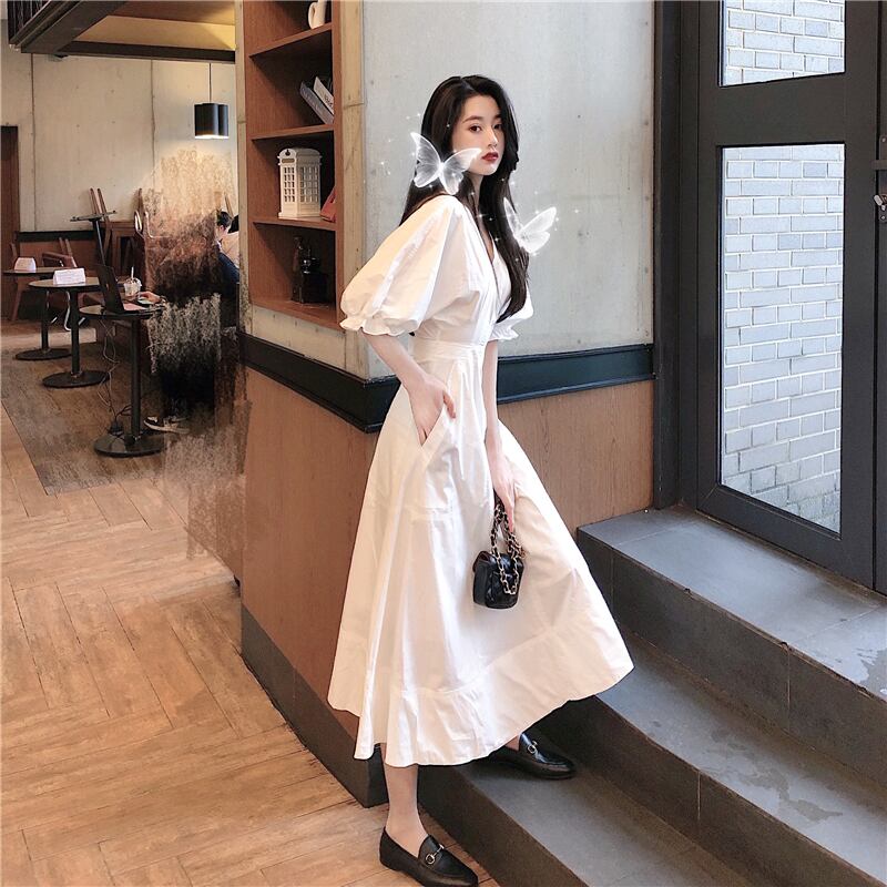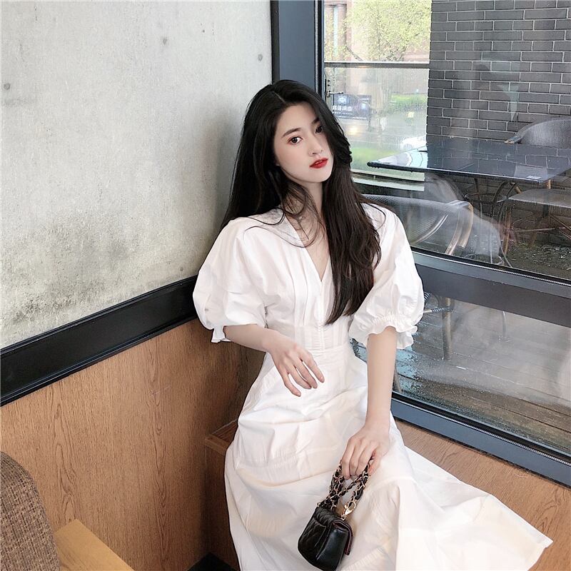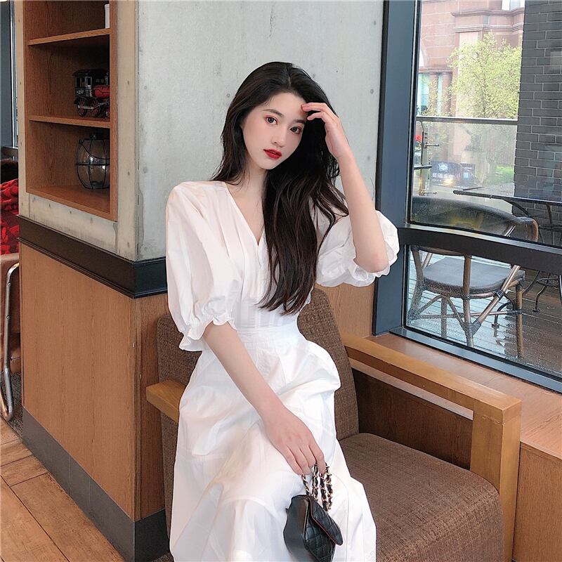 ドレスレディースサマードレス2020新バージョンのVネックホワイト半袖ウエストと薄いフレンチミドル丈スカート 1号婦人76737472345