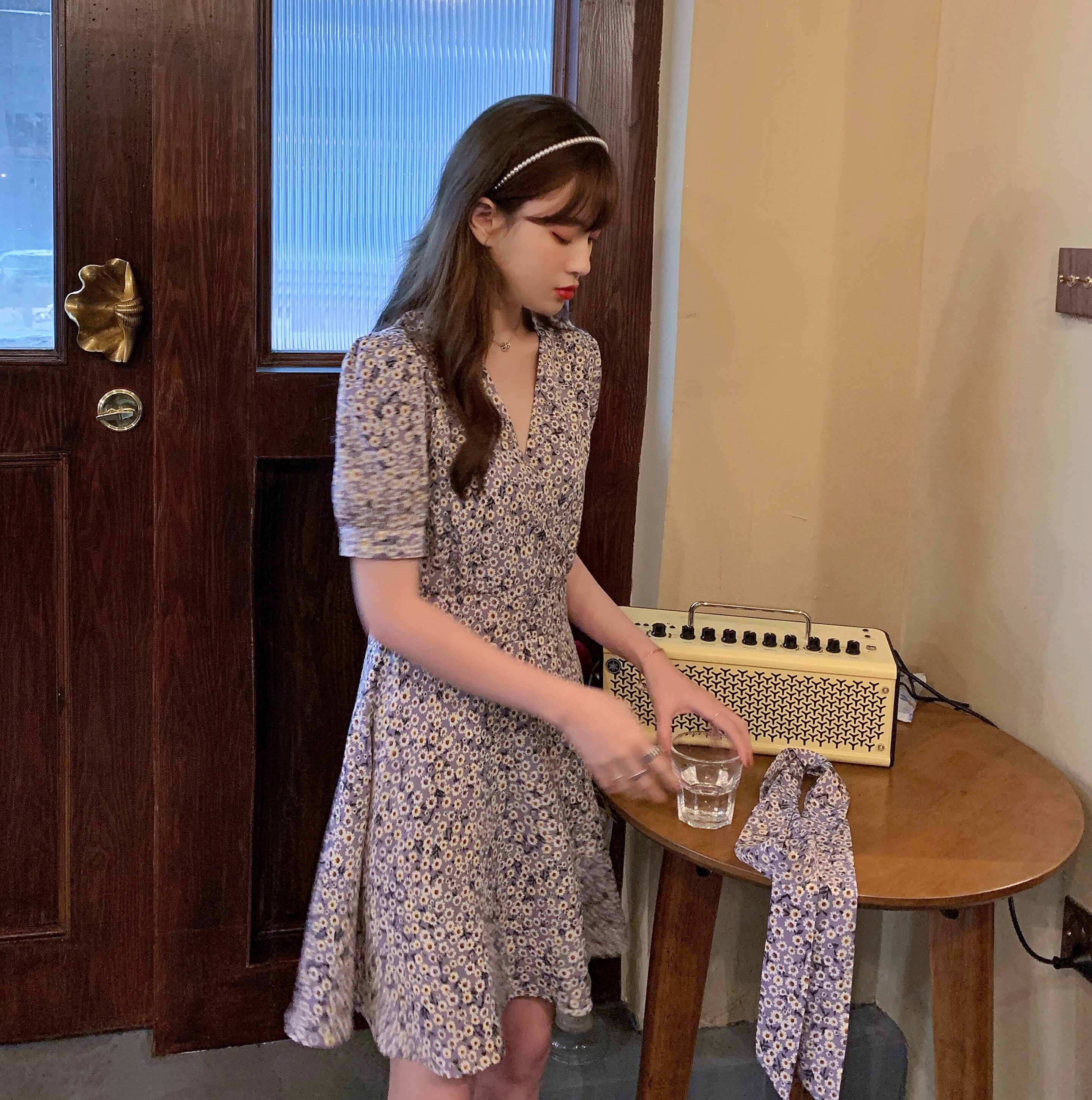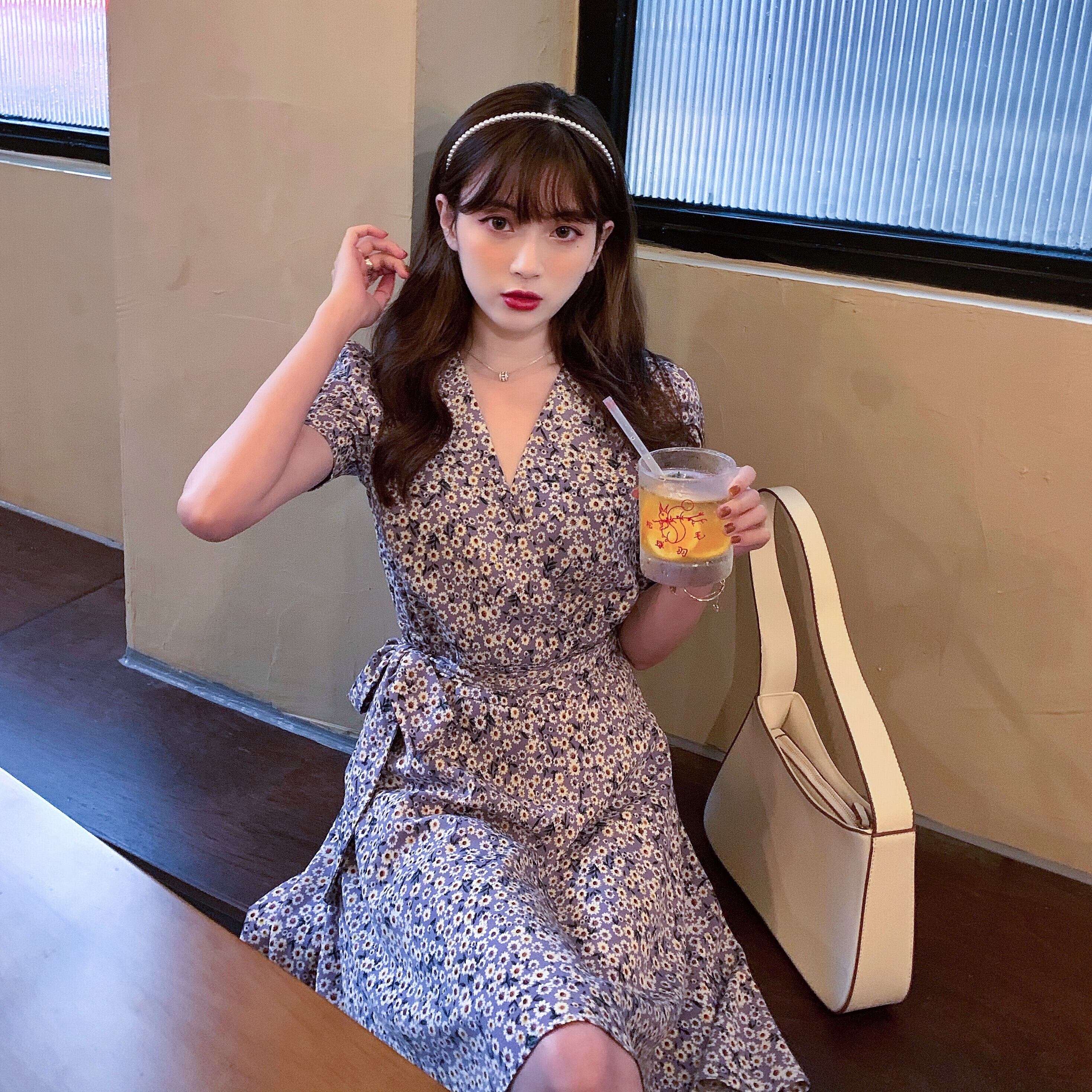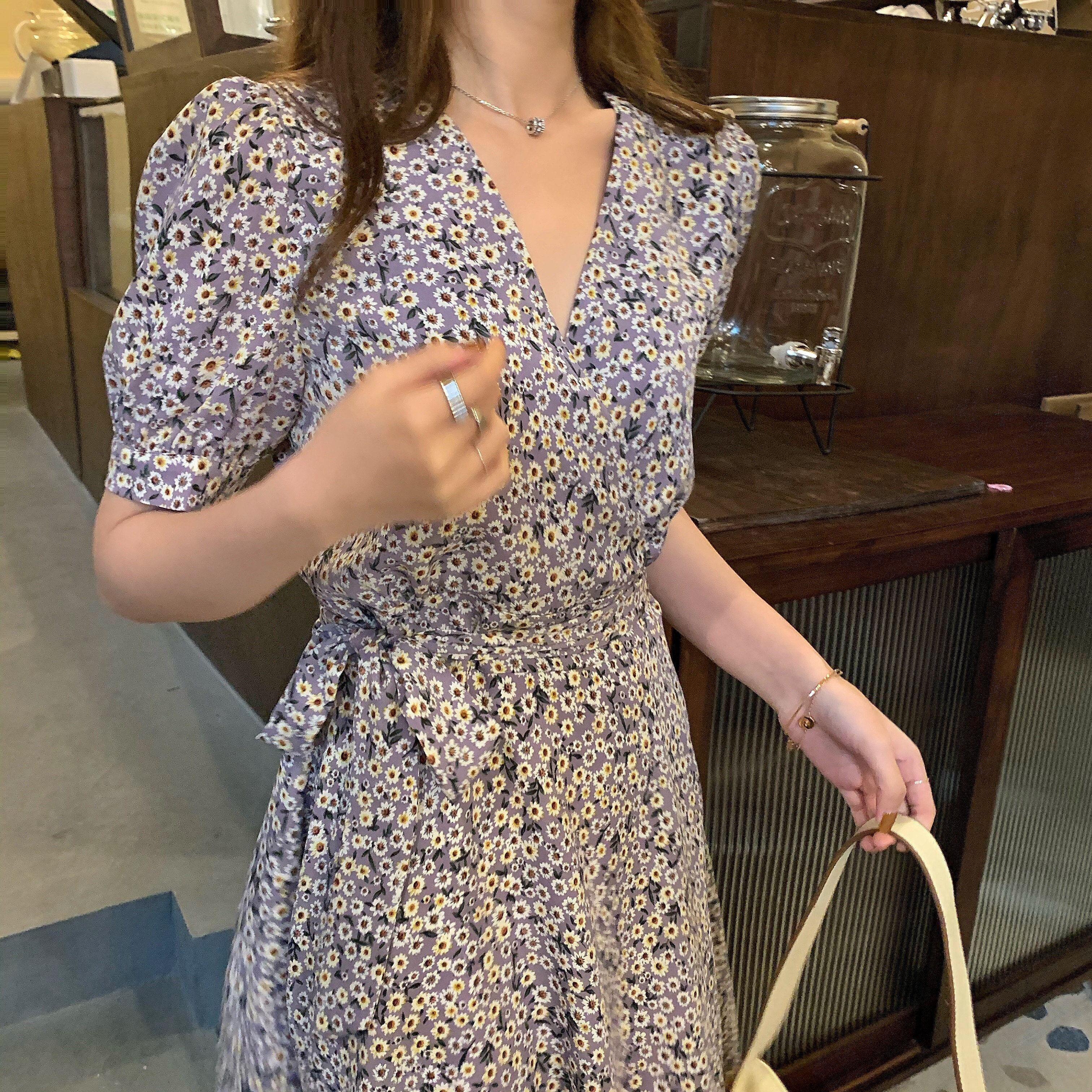 2020年夏のニュースタイルパープルVネックスモールデイジーフローラルドレス女性気質ウエストネクタイAラインショートスカート 1号婦人23826370400