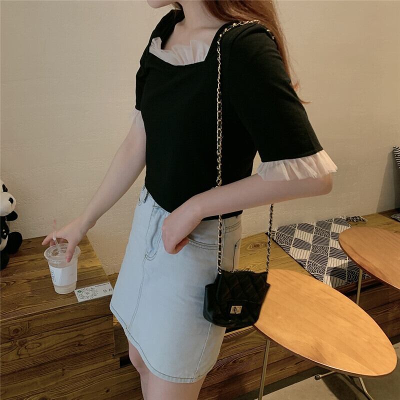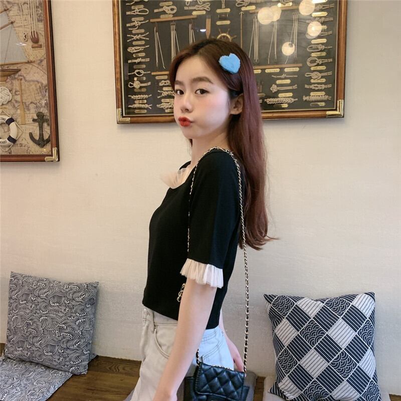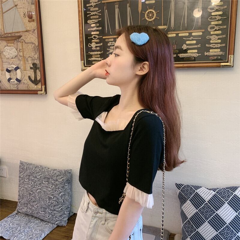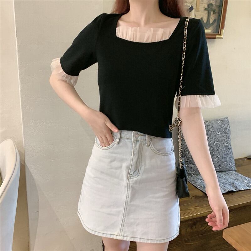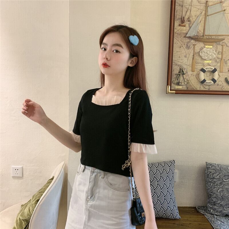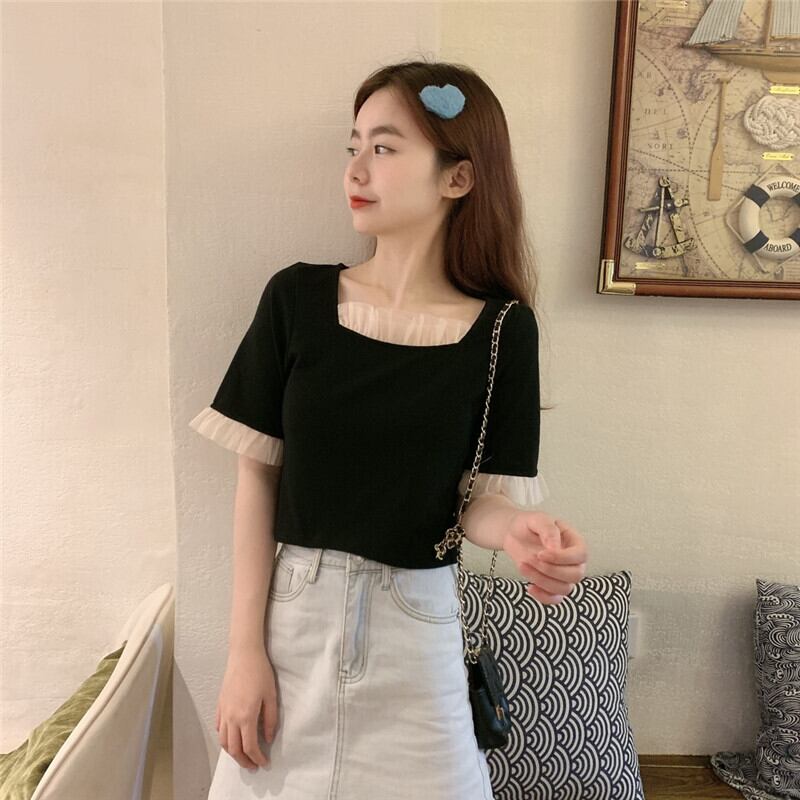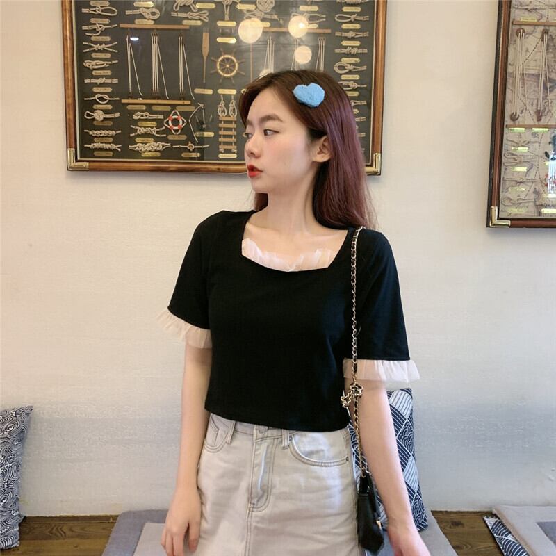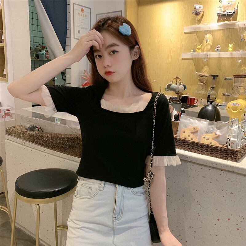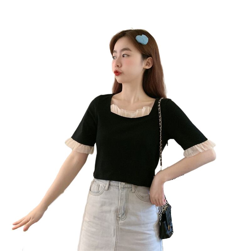 2020年夏の新作半袖Tシャツレディーススクエアネックステッチレーススウィートトップスリムスリミングブラックボトミングシャツ 1号婦人53181940035