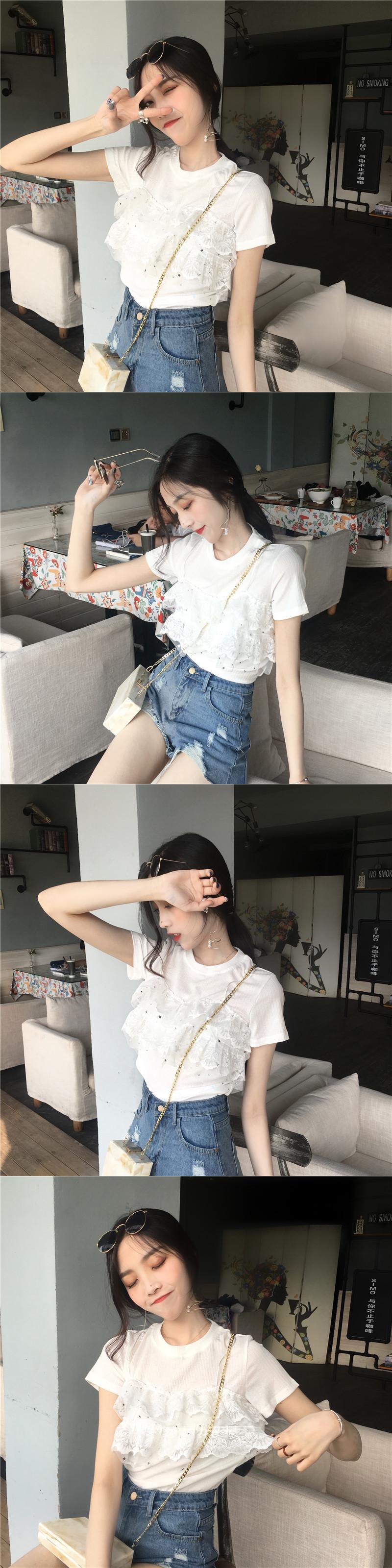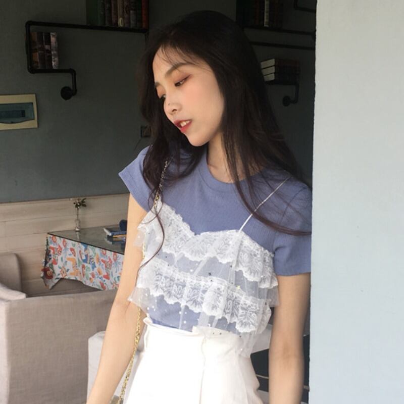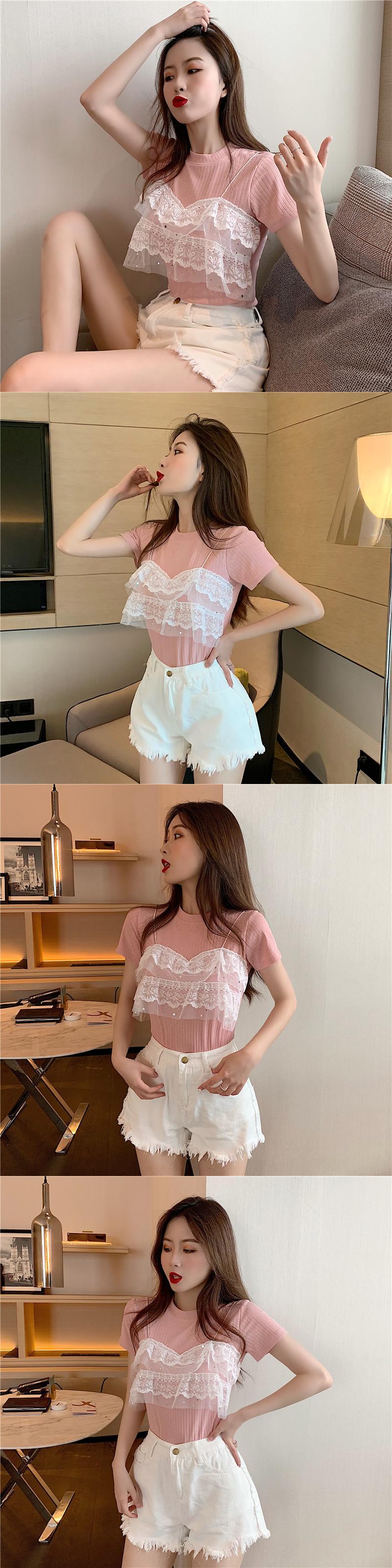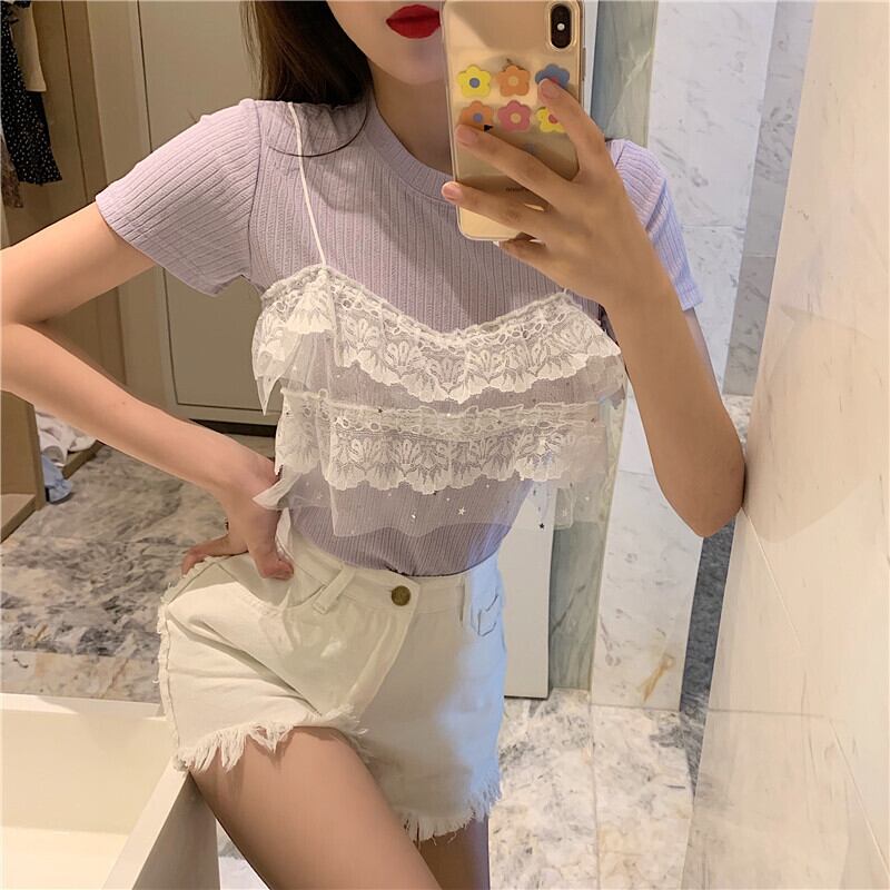 太郎パープルトップ半袖ボトミングシャツレディース2020新夏ドレススリミングレーススリングフェイク2枚ショートTシャツ 1号婦人82096477589