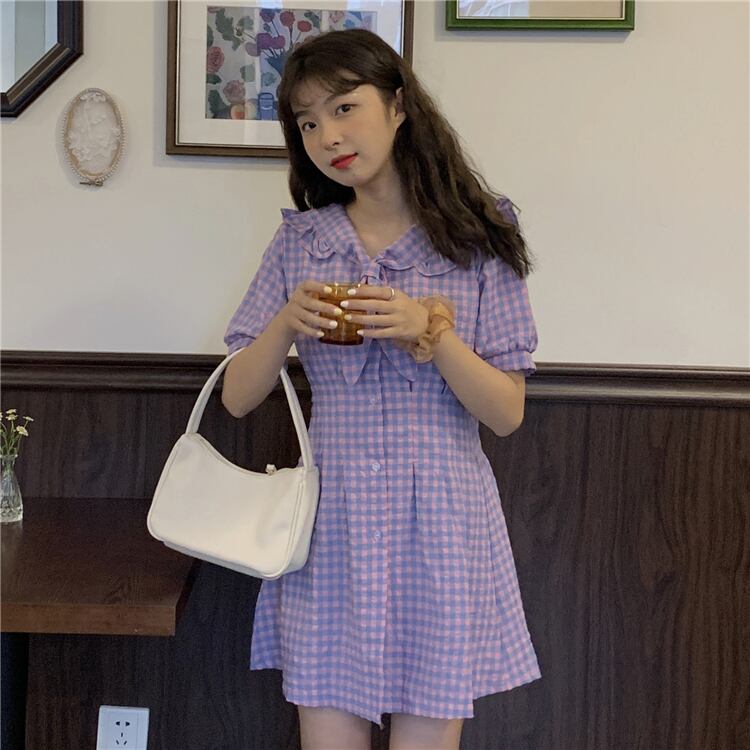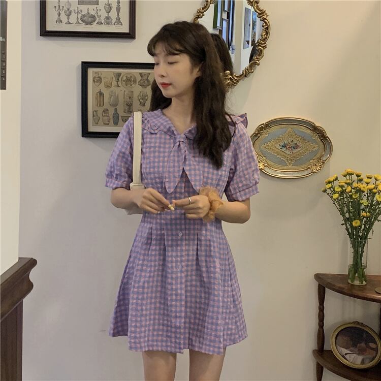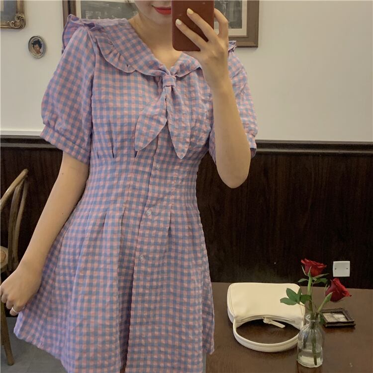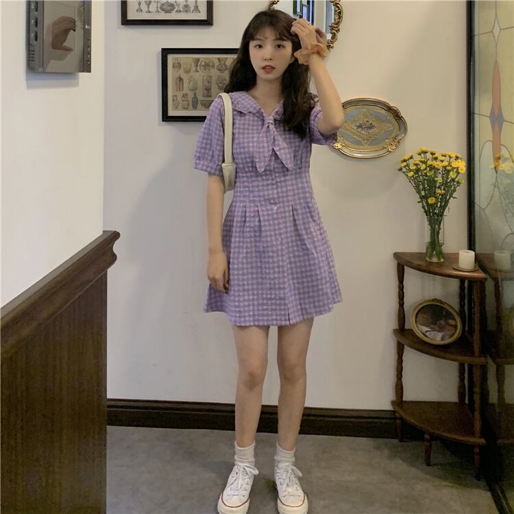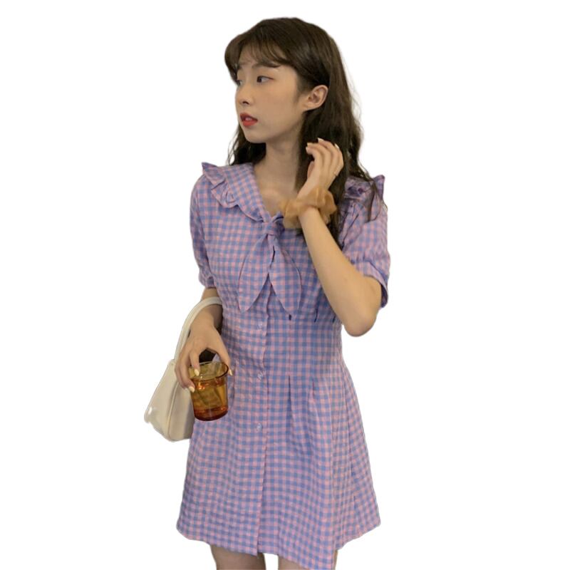 フレンチニッチドレス女性新夏レトロチェック柄パープルAラインスカートネイビーカラーハイウエストスリムショートスカート 1号婦人8060964572