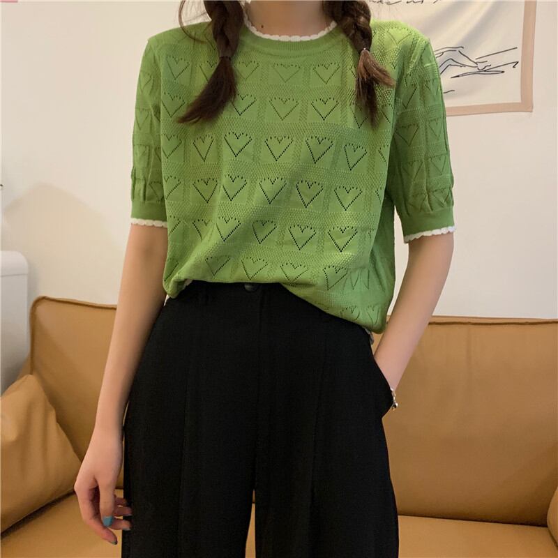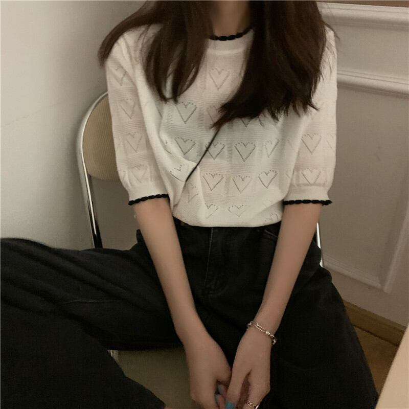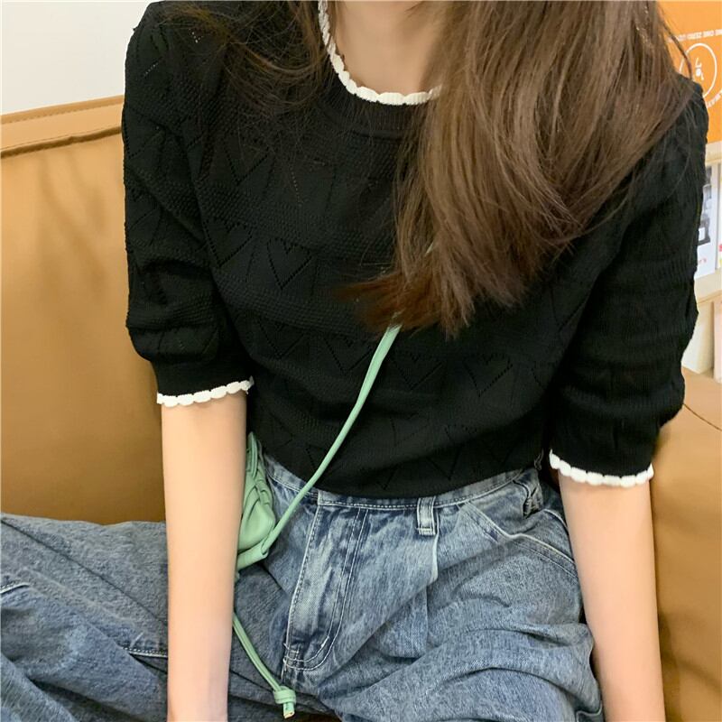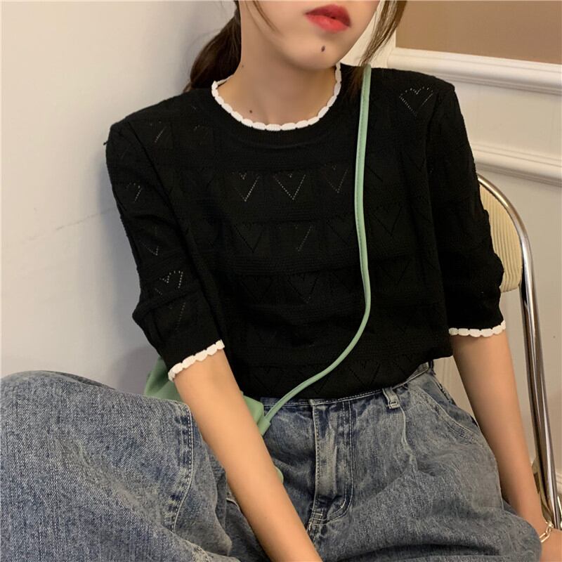 非常にフェアリートップデザインセンスニッチ中空愛セーター夏ルーズコントラスト半袖半袖Tシャツトレンド 1号婦人47936707304
