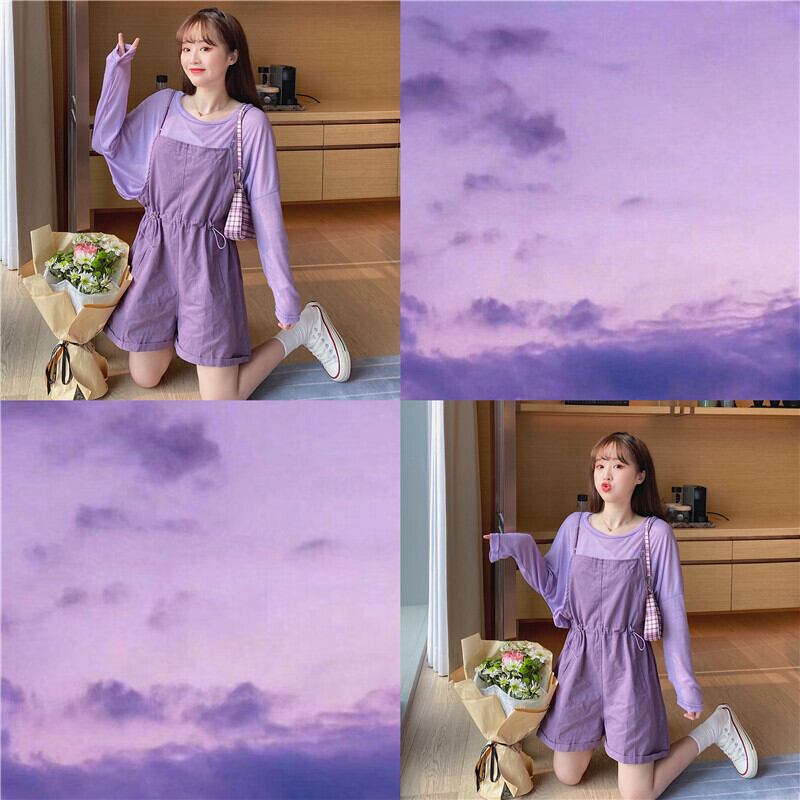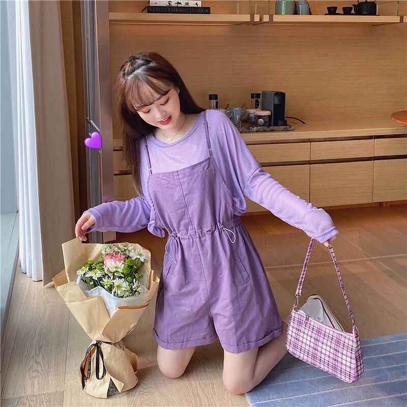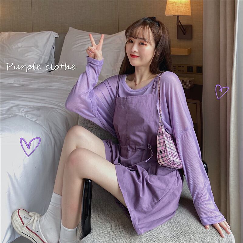 若者の年齢削減スーツ女性の夏の新しいスタイルの長袖紫Tシャツトップ学生ルーズカジュアルパンツサスペンダーパンツ 1号婦人87185566185