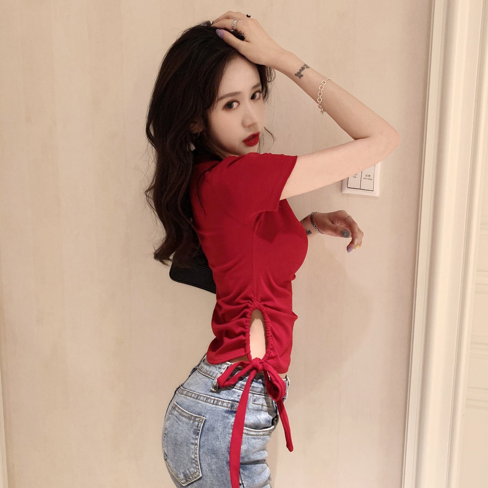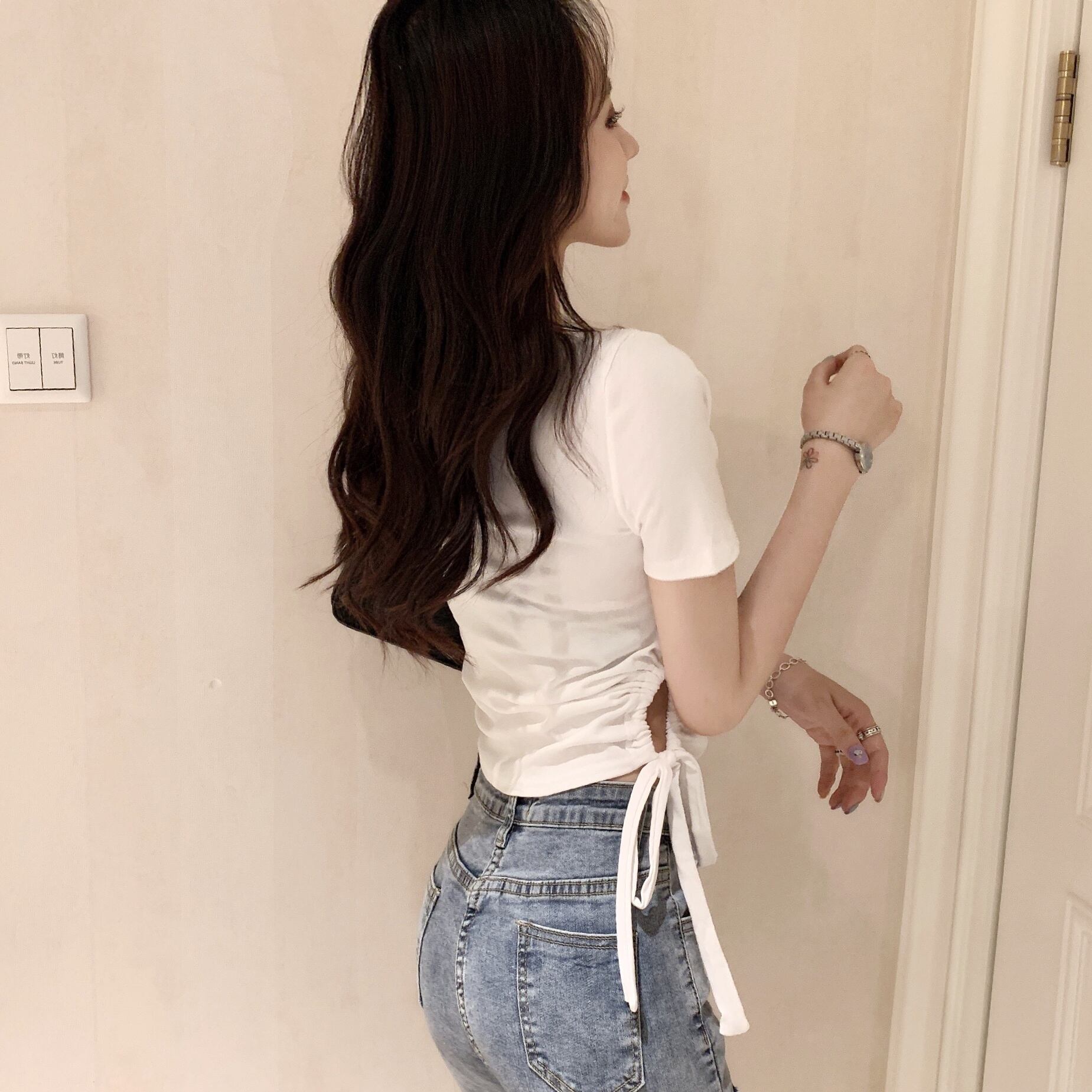 半袖Tシャツ女性の2020年夏の新しい香港フレーバー不規則なしわ引きひも白いボトミングシャツトップトレンド 1号婦人84969457482