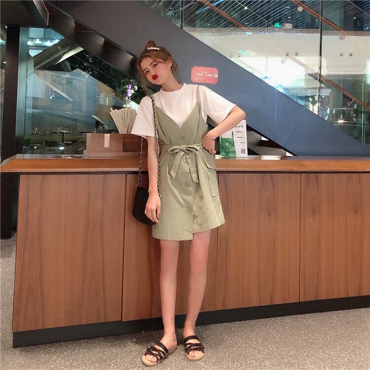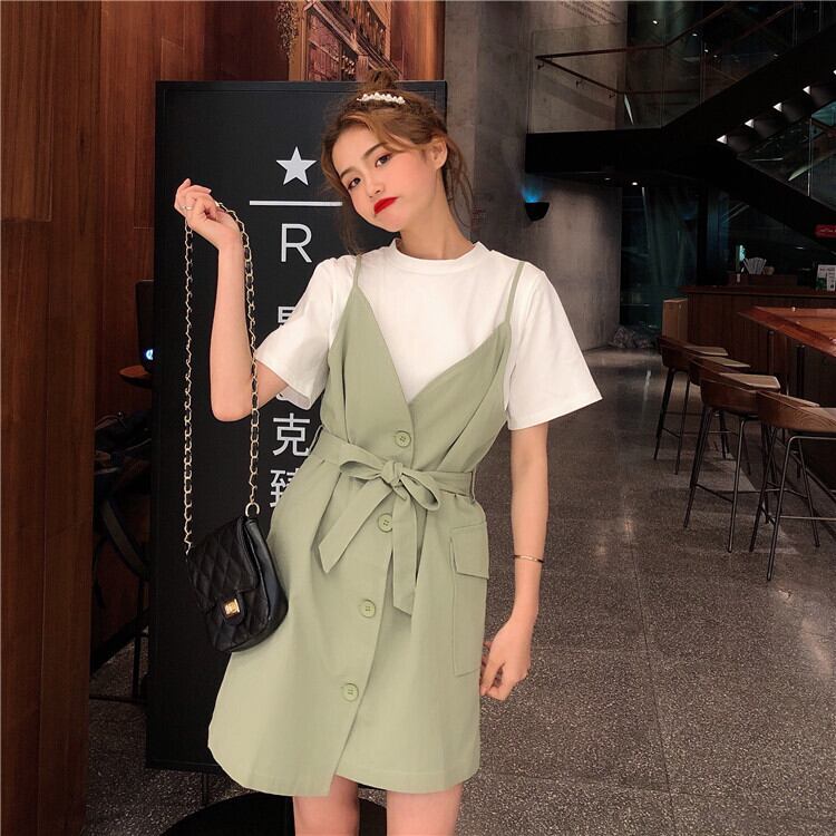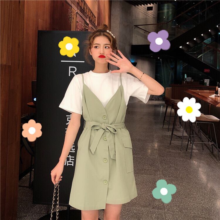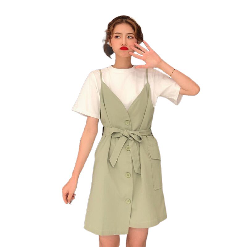 スーツ2020新しい女性のサマードレスウエスタンスタイルの白い半袖Tシャツトップサスペンダードレスツーピーススーツ 1号婦人70673137675