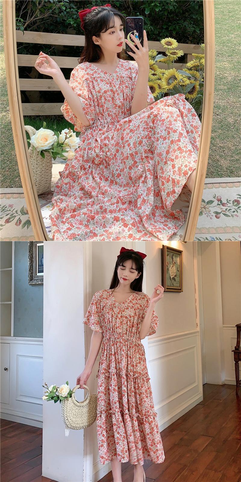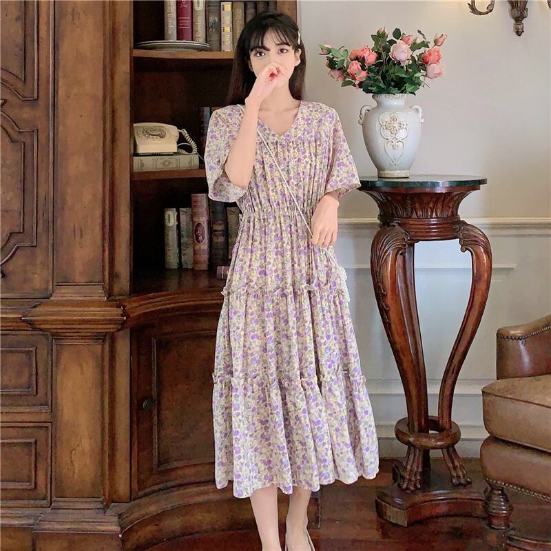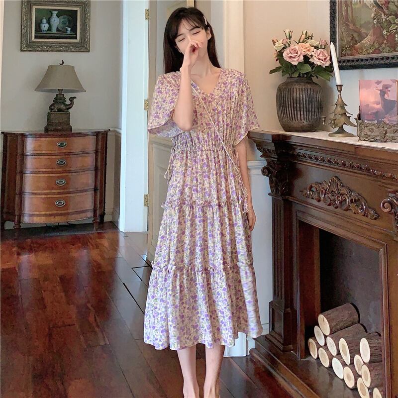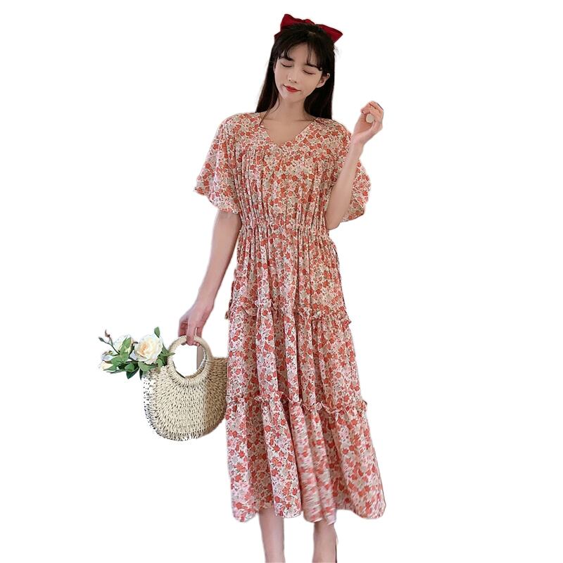 ドレスレディース2020サマーウエストウエスト細いAラインミドル丈スカートVネックウエスタンシフォンフローラルドレス 1号婦人62854797554