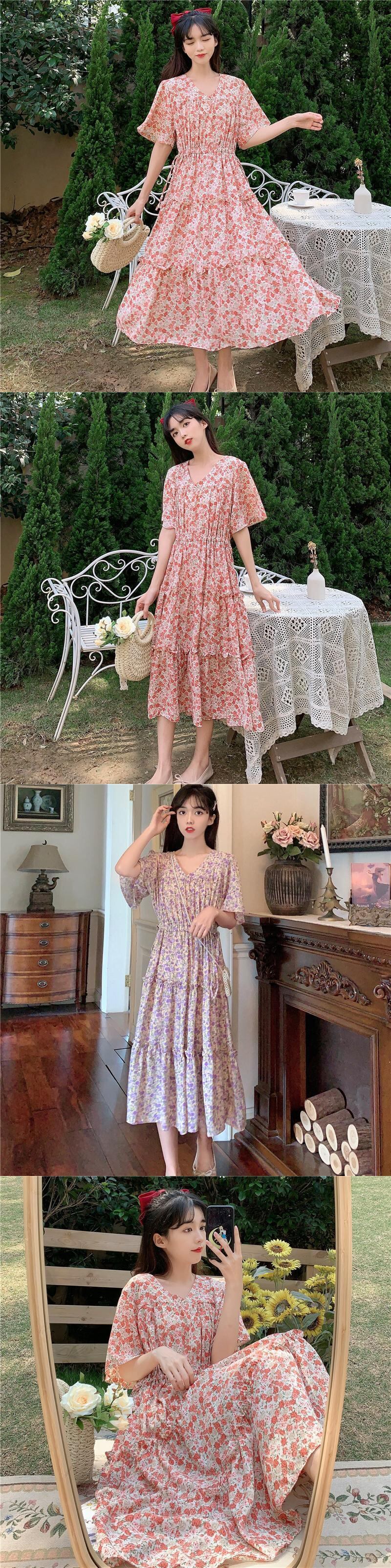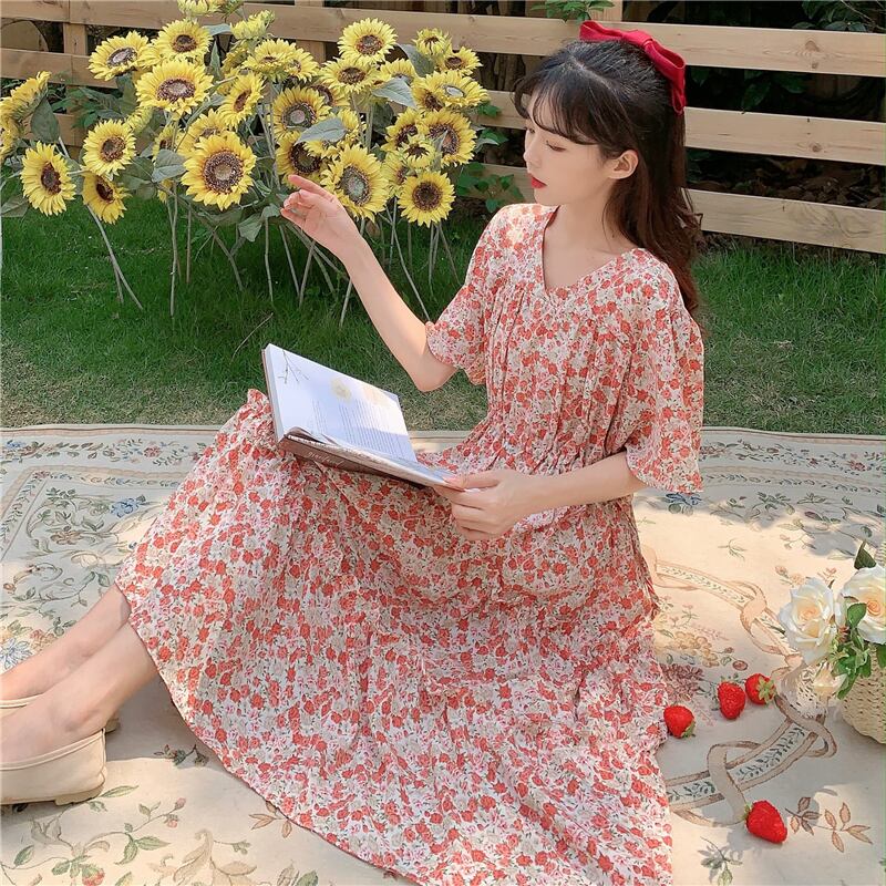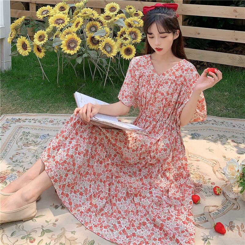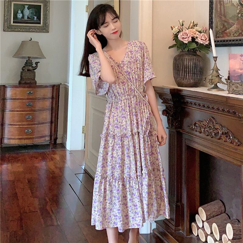 ドレスレディース2020サマーウエストウエスト細いAラインミドル丈スカートVネックウエスタンシフォンフローラルドレス 1号婦人62854797554
