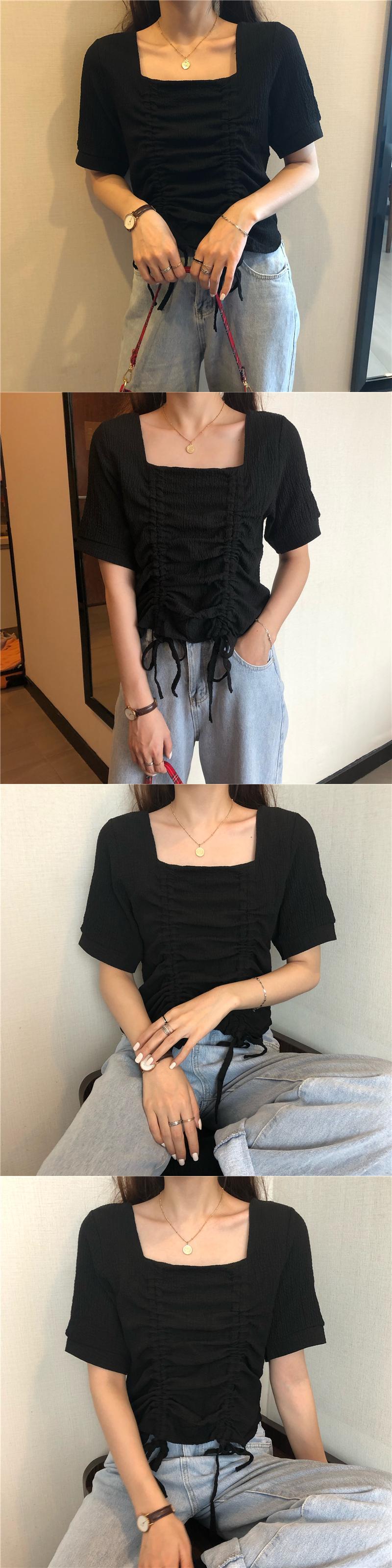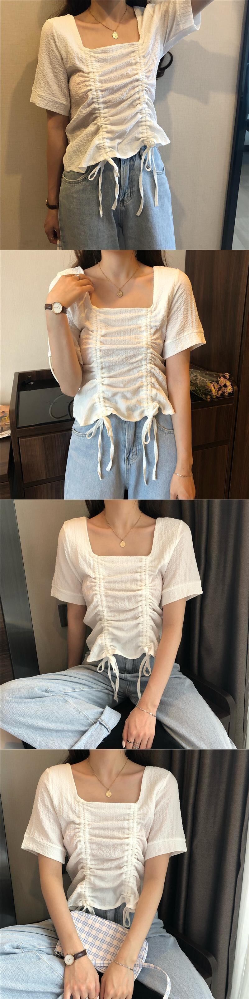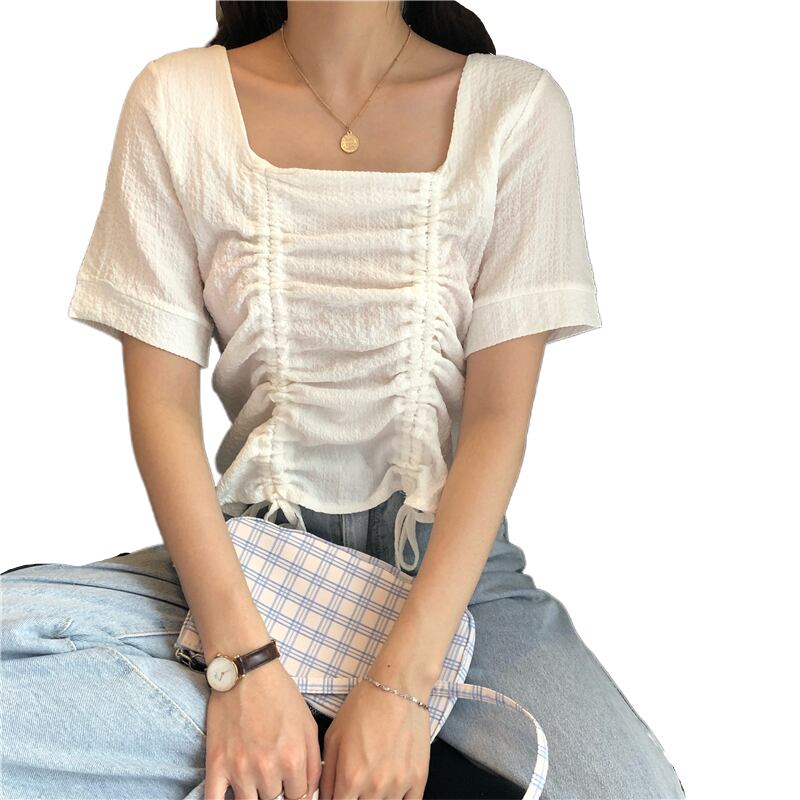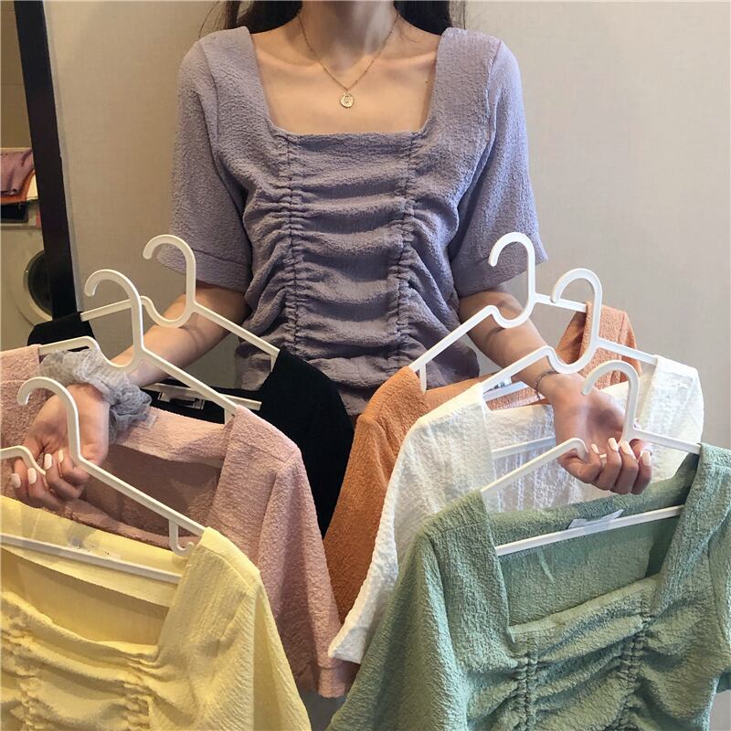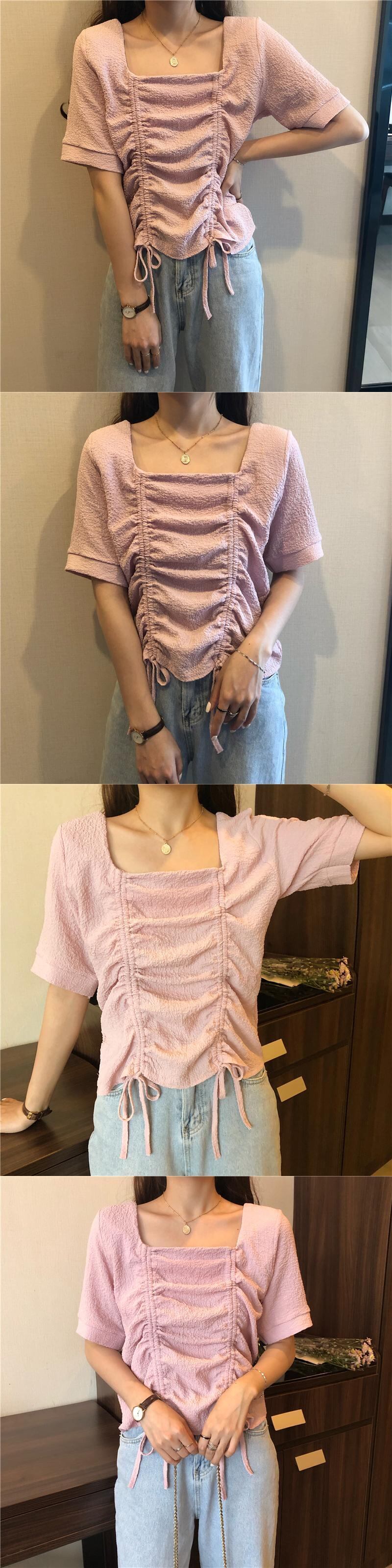 パープル半袖トップ2020新しい女性サマーポートスタイルシャツデザインニッチフォールドスクエアネック巾着シャツ 1号婦人7051615593