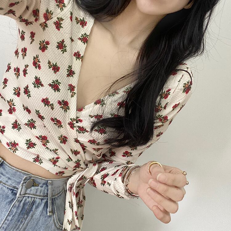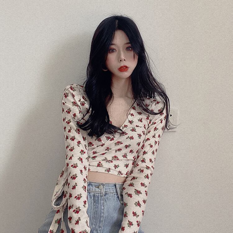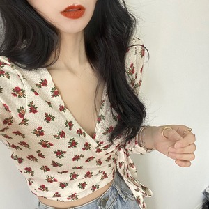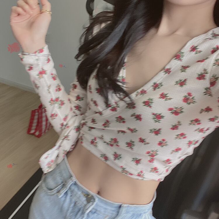 マシンに注意してください、短いnavel-baringトップス、女性の夏服、新しいレース、Vネック、スリムなボトミングシャツ、花柄の長袖Tシャツ 1号婦人82490213305