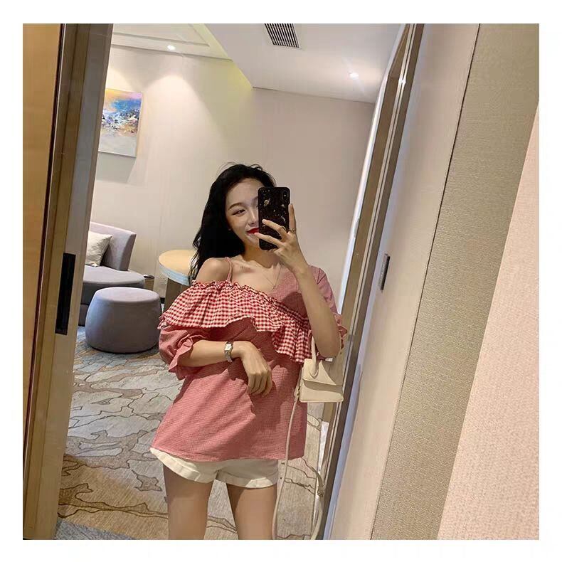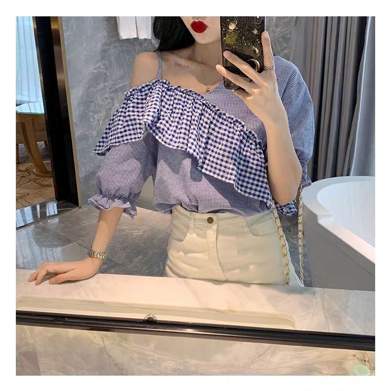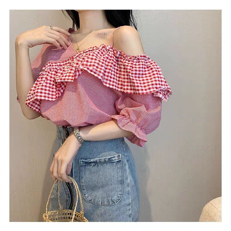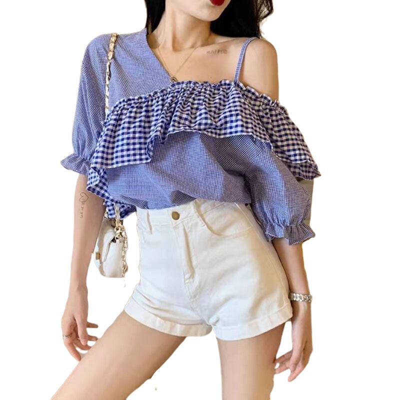 夏の不規則なストラップレスチェック柄ステッチシャツシャツ半袖ルーズ気質フリルレディースシャツ 1号婦人7920840002