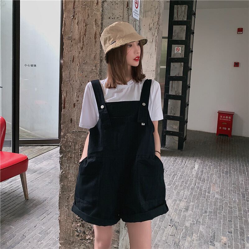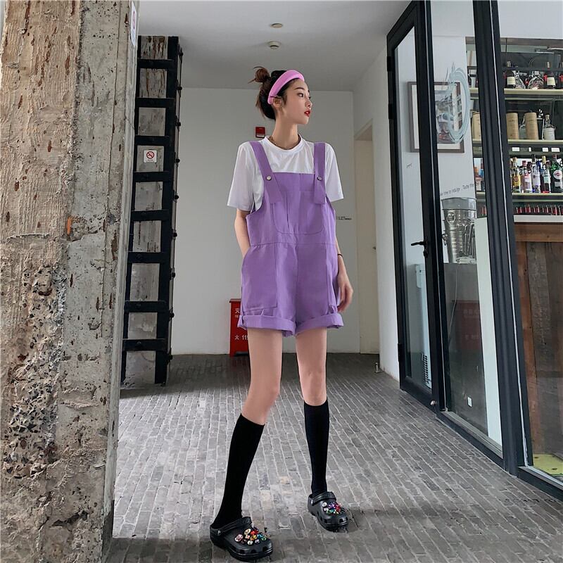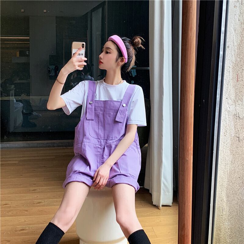 色:白いTシャツ,パープルバックショーツ,黒いオーバーオール