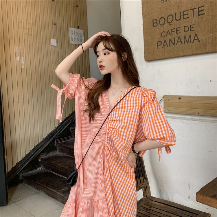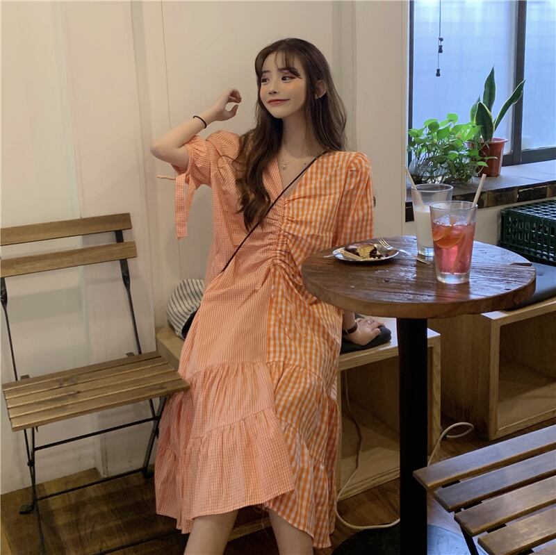 フランスのニッチな気質ドレスの女神ファン2020新しいサマードレスプリーツステッチチェック柄Aラインミドル丈スカート 1号婦人61971002919