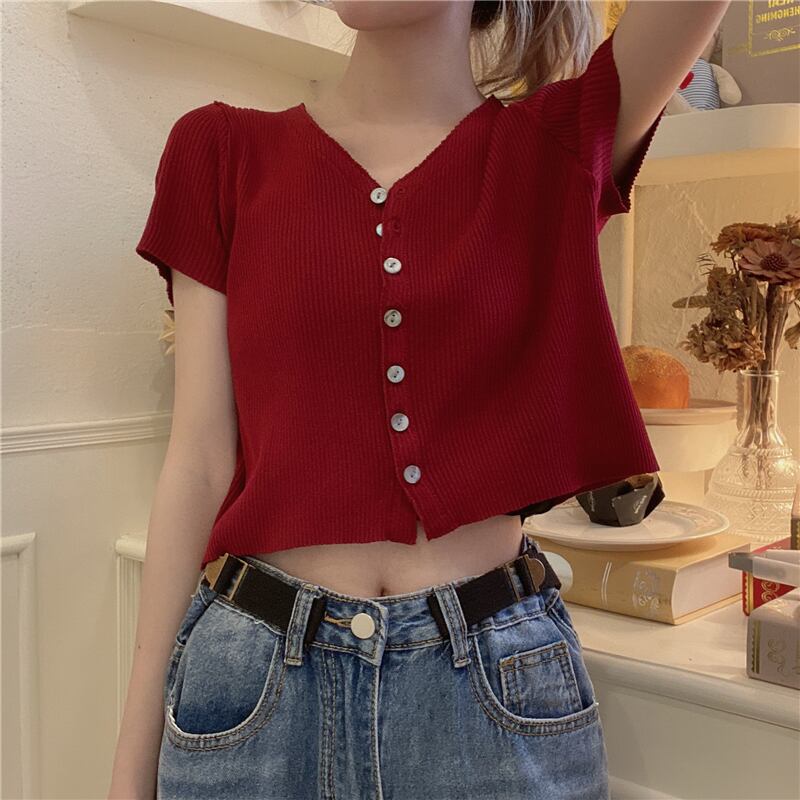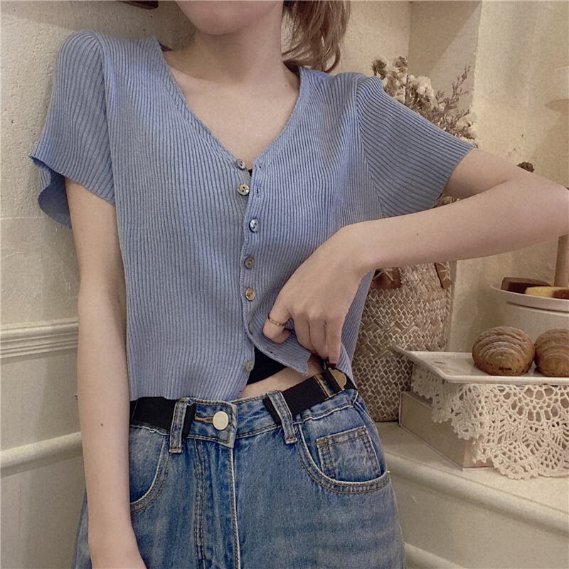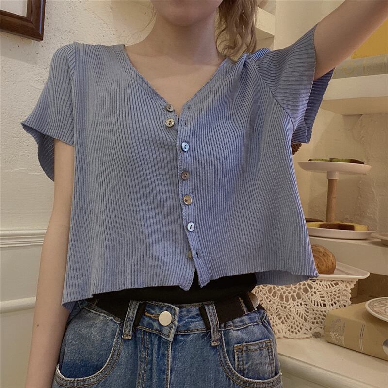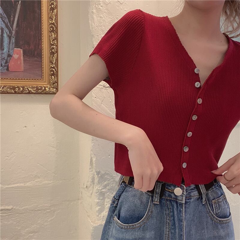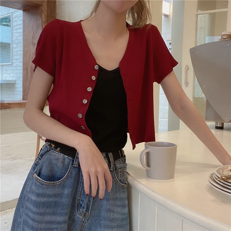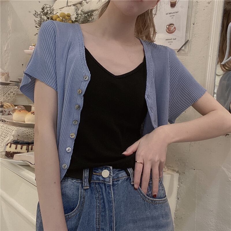 2020年春夏新作レトロスリムスリムセクシーショートVネックブラックニット半袖カーディガントップス婦人服 1号婦人44549178433