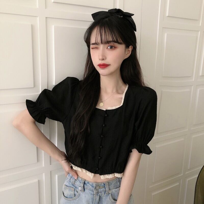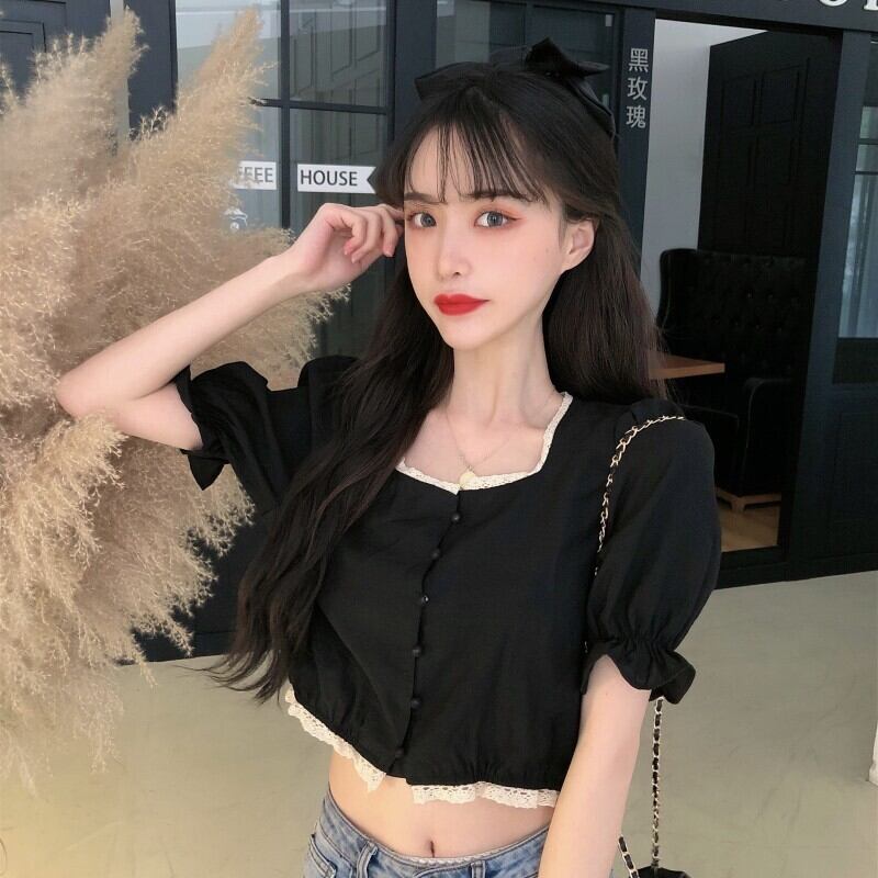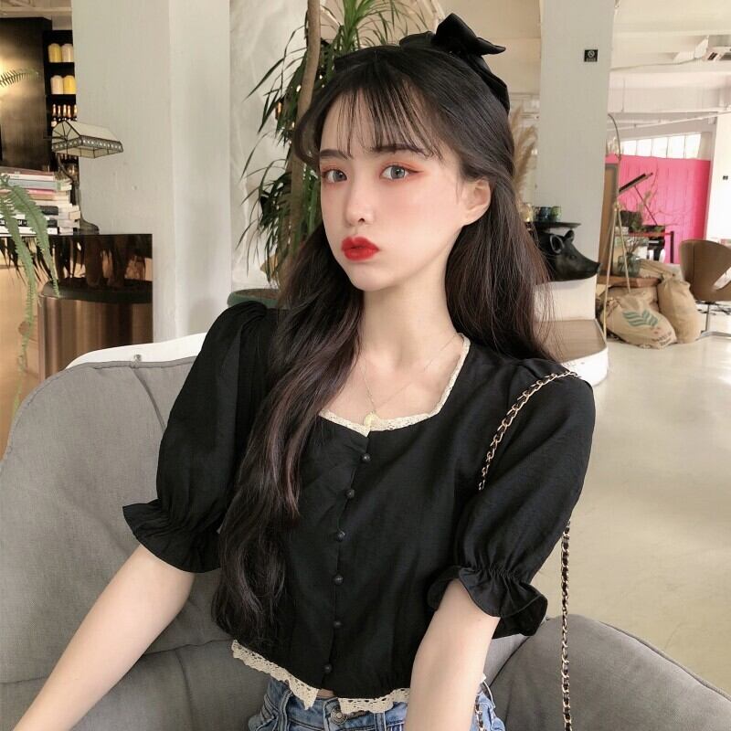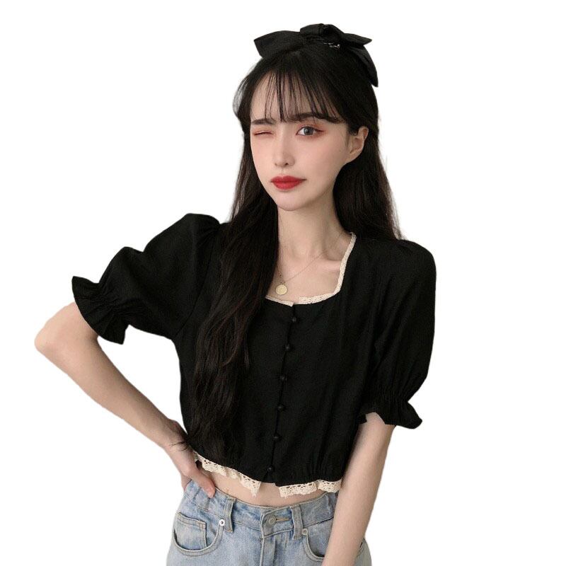パフスリーブトップレディースサマードレス2020新入生レースステッチスクエアネック半袖半袖シャツトレンド 1号婦人55926672771