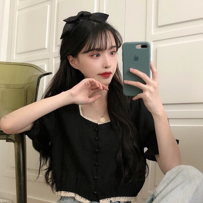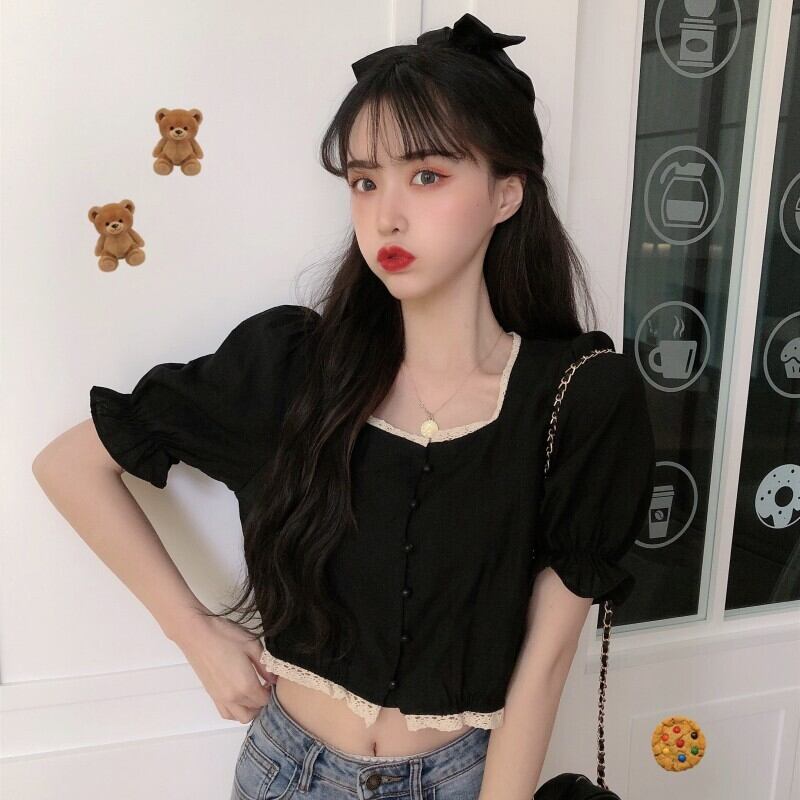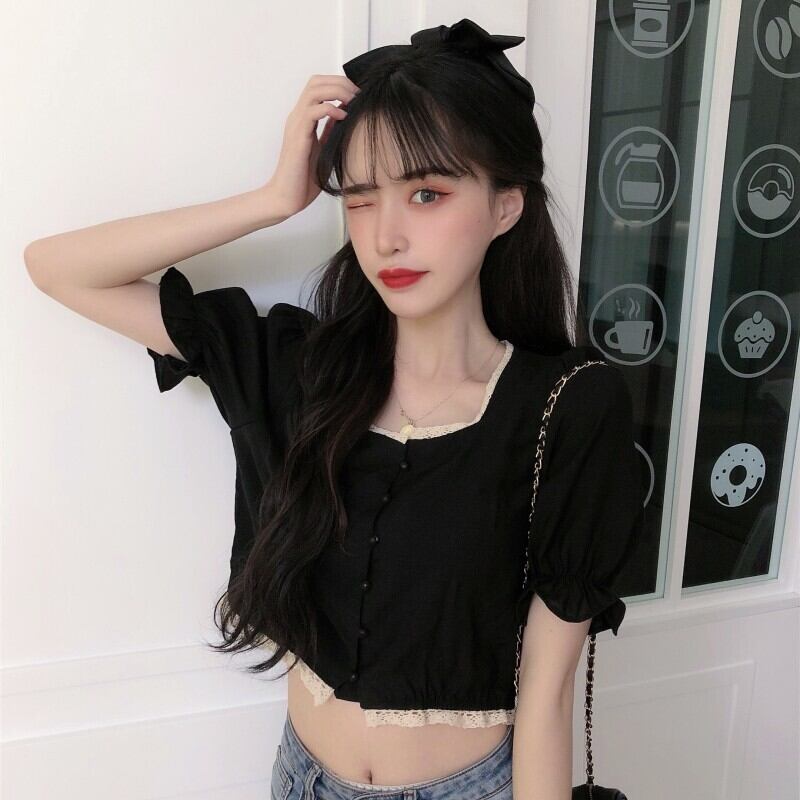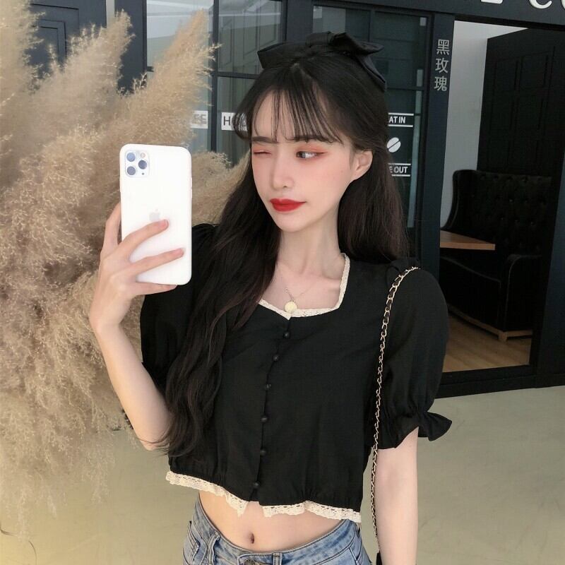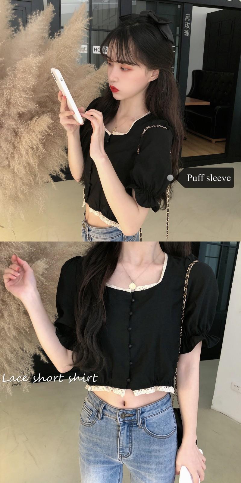 パフスリーブトップレディースサマードレス2020新入生レースステッチスクエアネック半袖半袖シャツトレンド 1号婦人55926672771