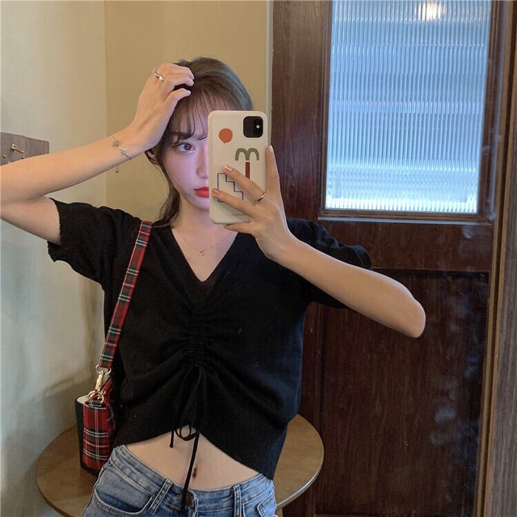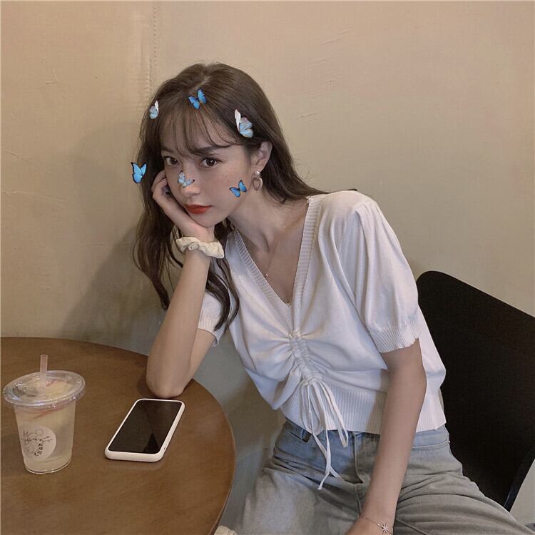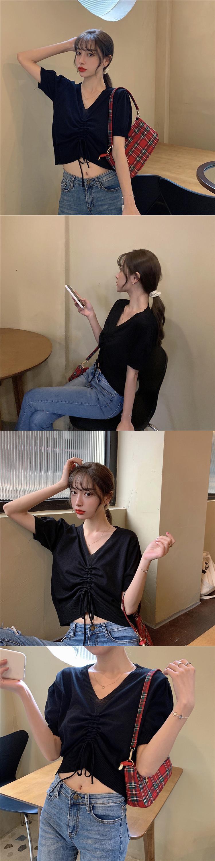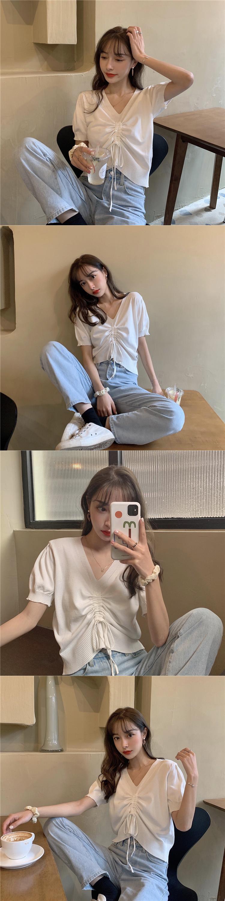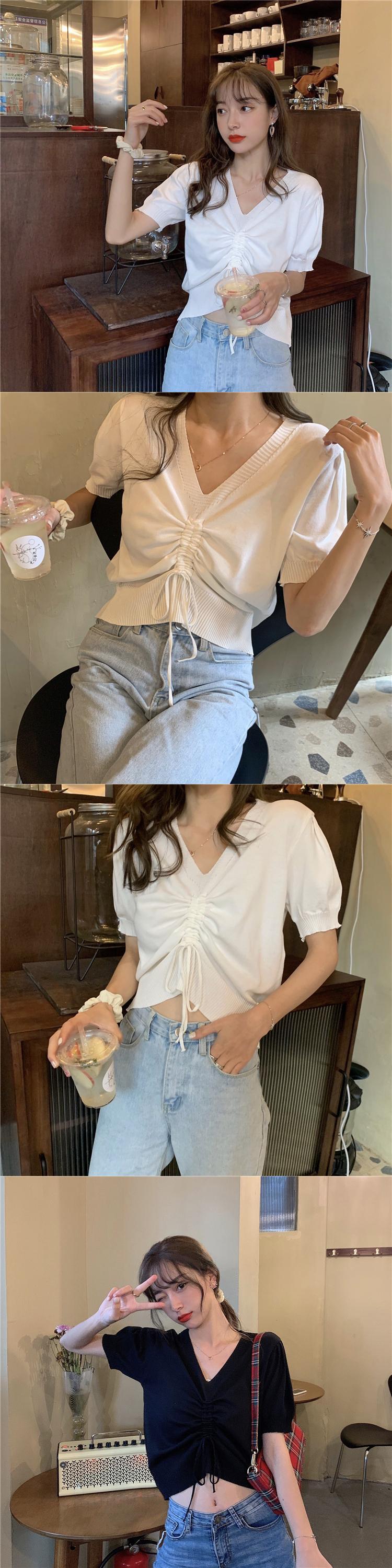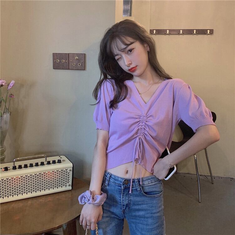 2020年夏のドローストリングVネック薄半袖セーター女性ショートパフスリーブパープルトップの新バージョン 1号婦人39165372047