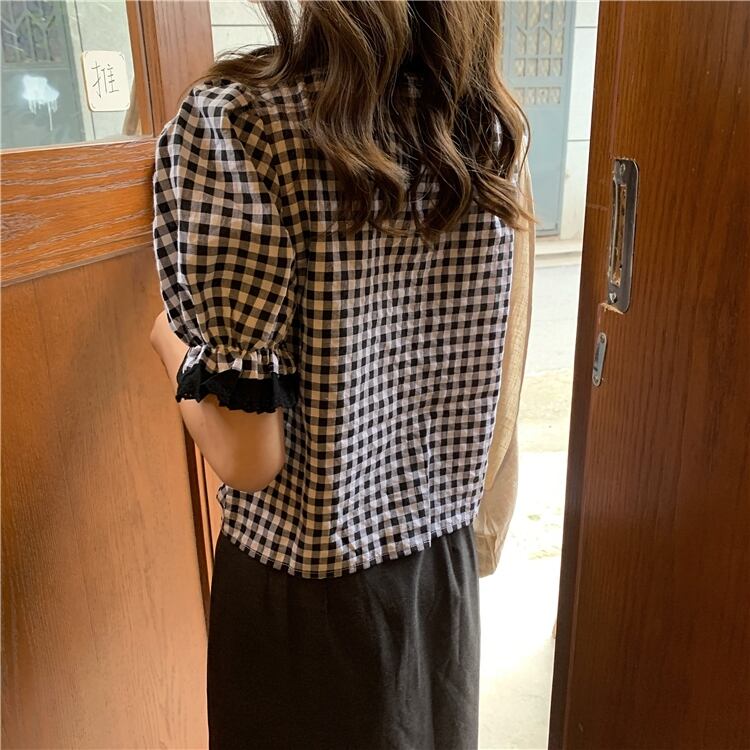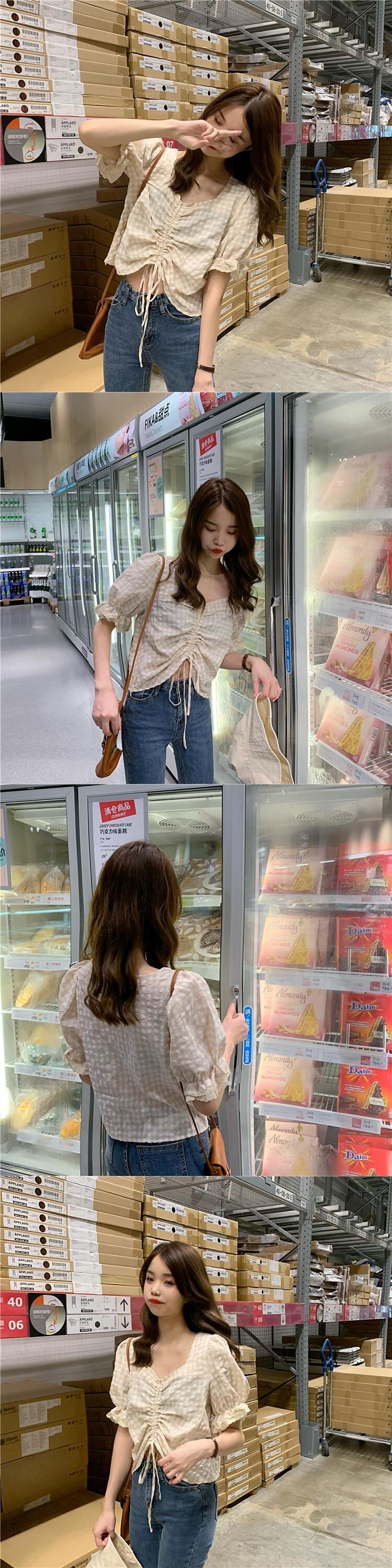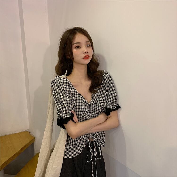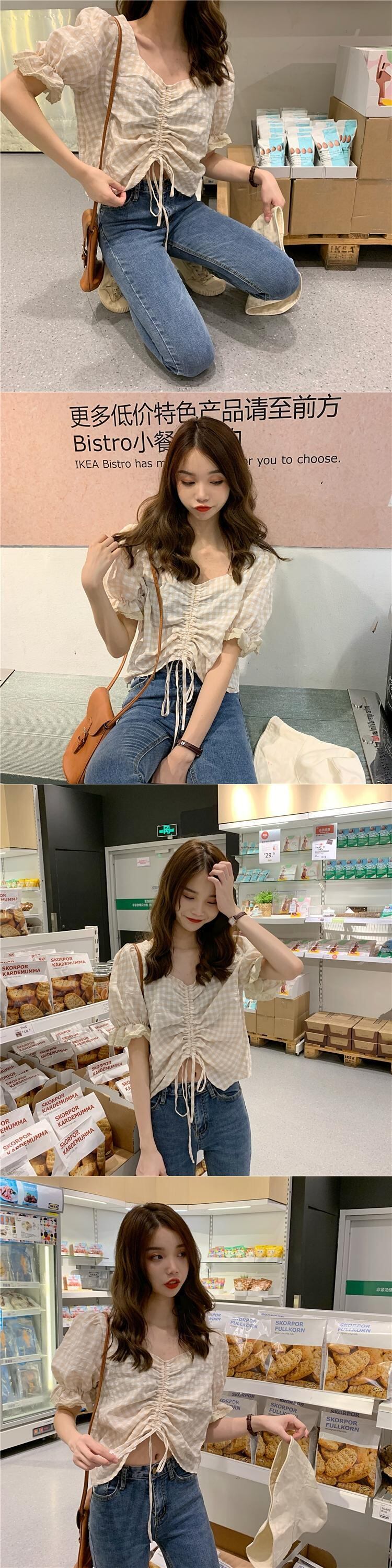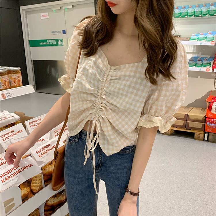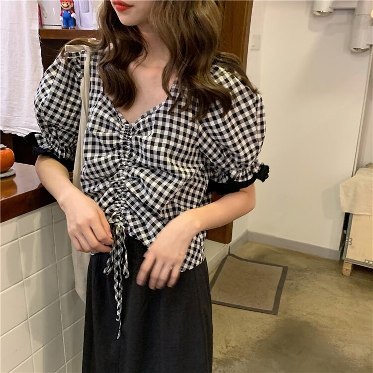 センスニッチバブル半袖レディースシャツ2020夏の新しいレトロな香港フレーバー巾着チェック柄トップドレス 1号婦人16867076945