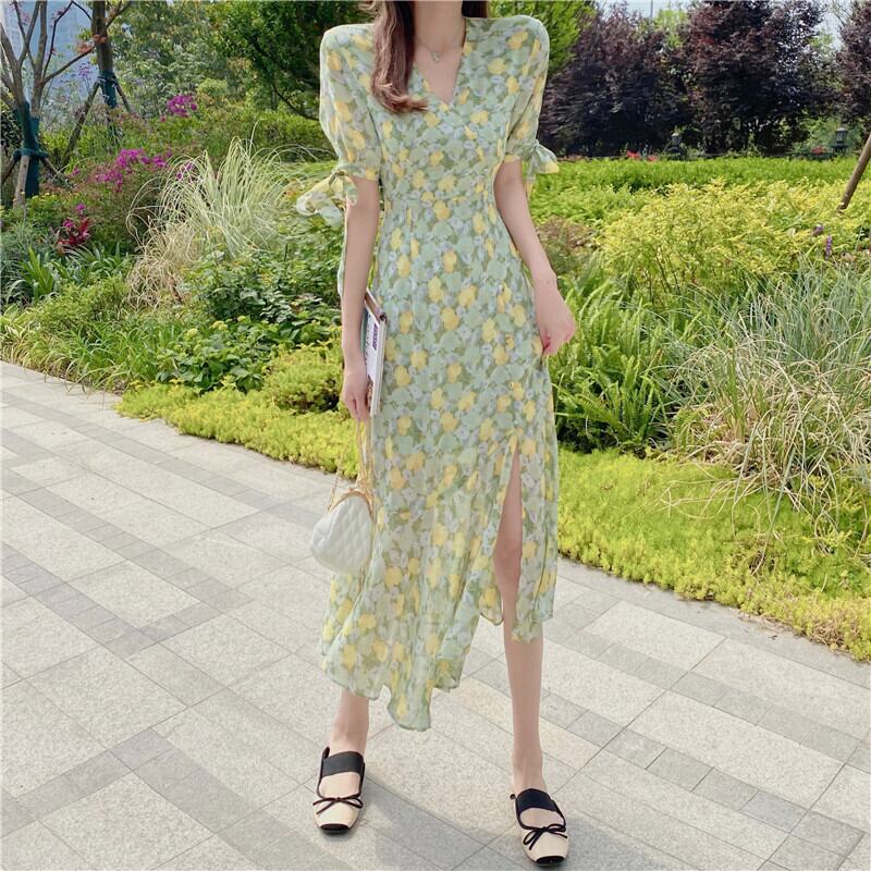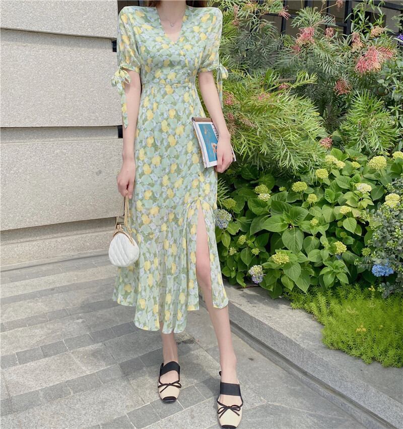 気質フローラルフレンチドレス女神ファン2020新夏ウエストスリミングスプリットシフォンスカートAラインスカート 1号婦人12375474627