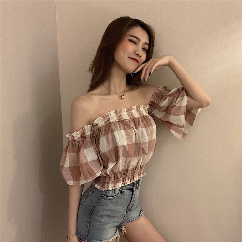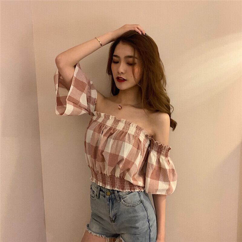 2020年夏の新しいセクシーなワンラインネックストラップレスレトロチェック柄シャツ女性シックなハイウエストスリムオールマッチトップ 1号婦人46410239175