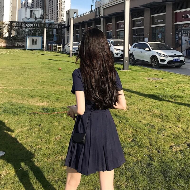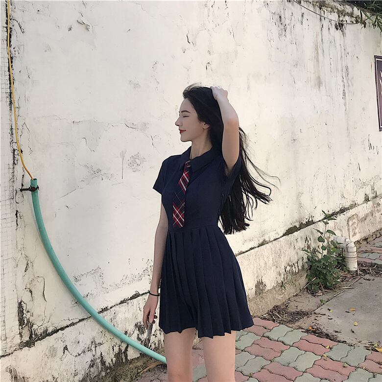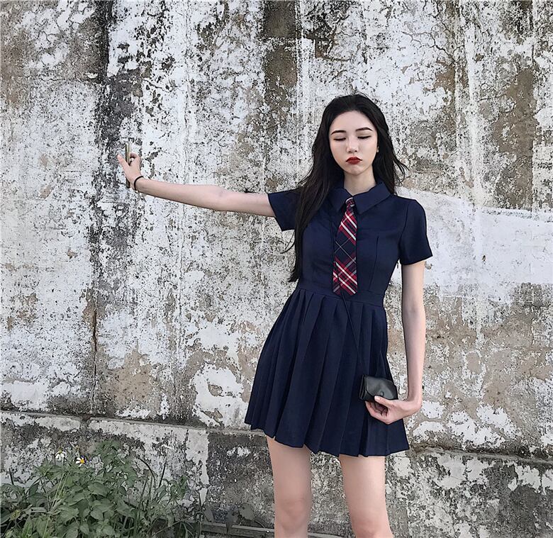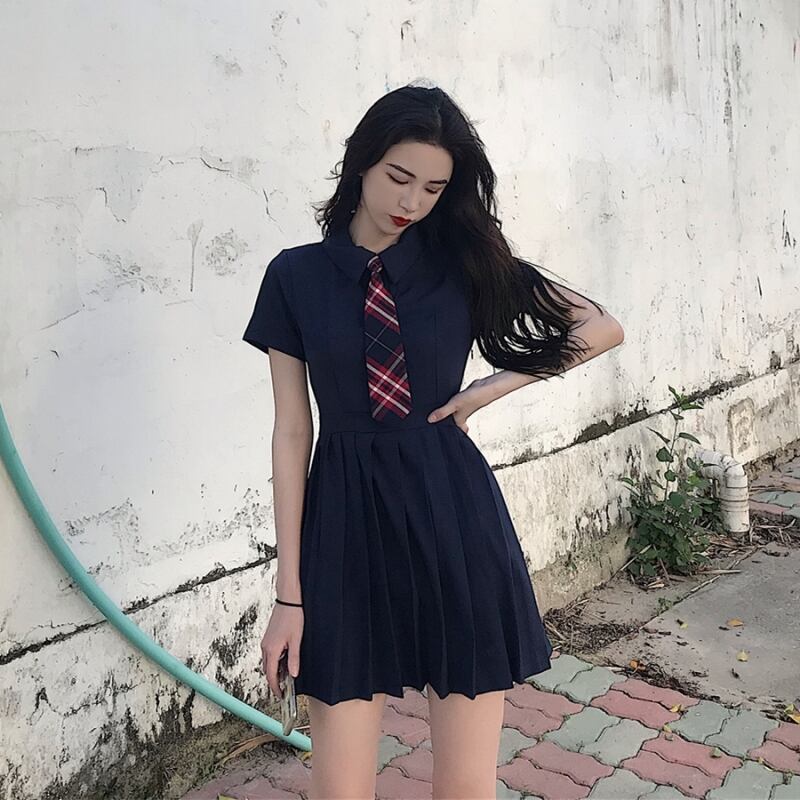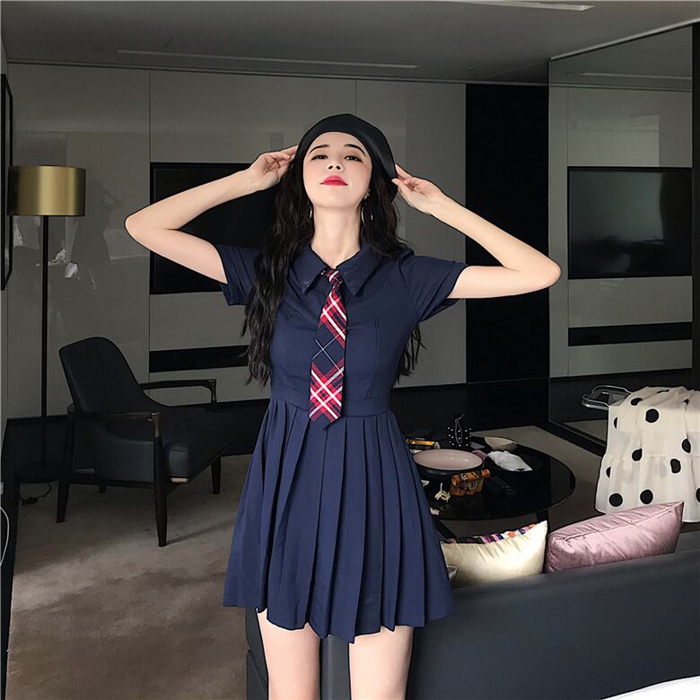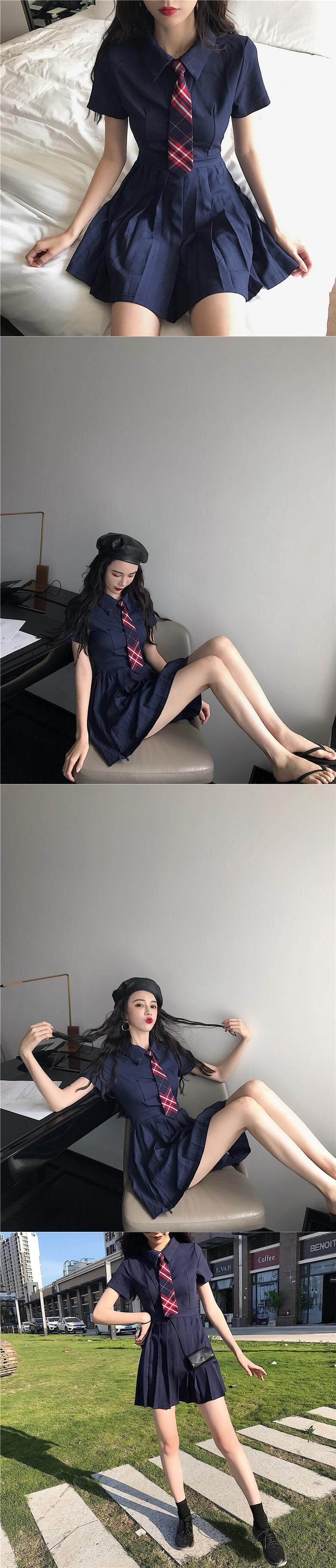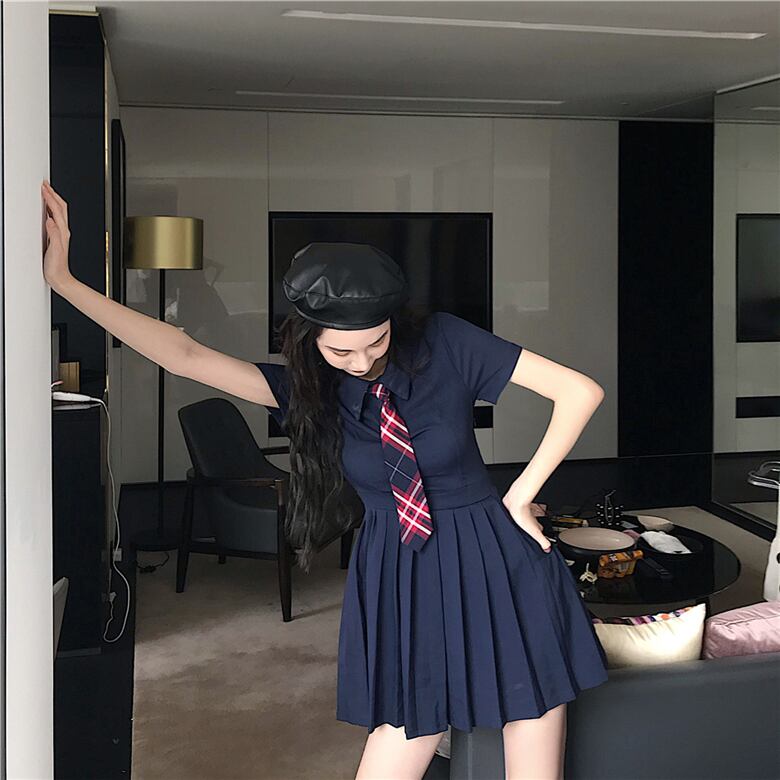 ドレスレディースサマードレス2020POLOカラースリムウエストウエストと薄手の気質半袖プリーツスカートネクタイ付き 1号婦人19916074472