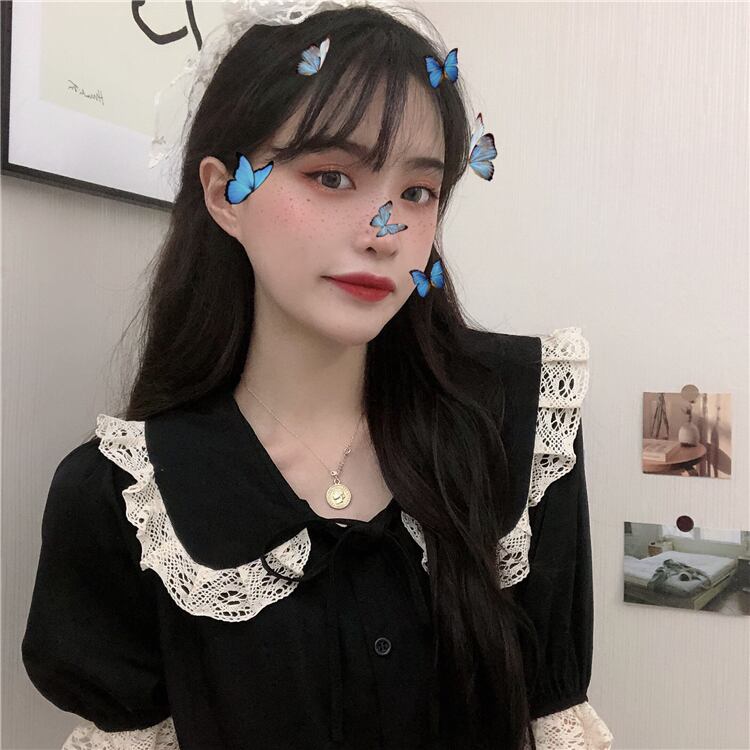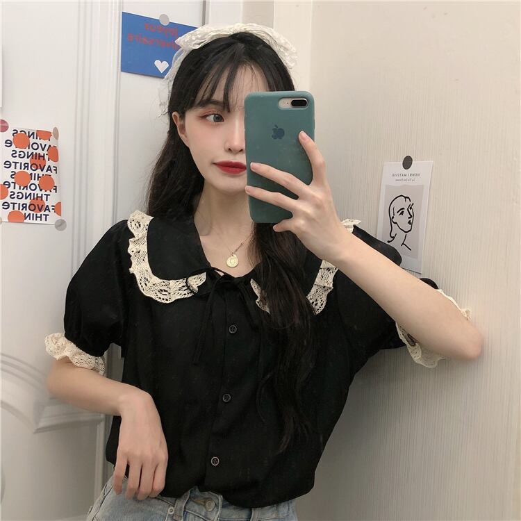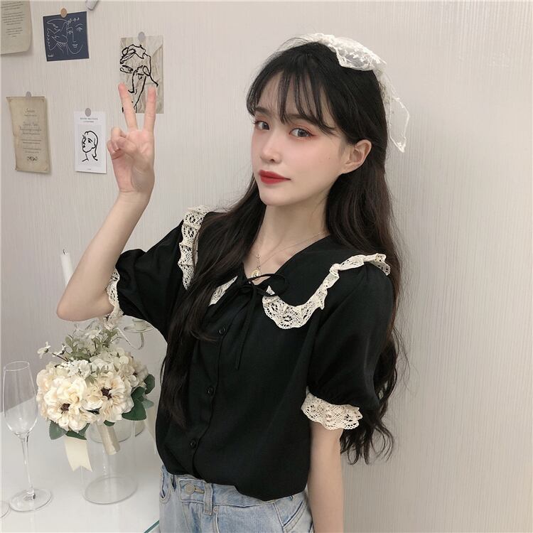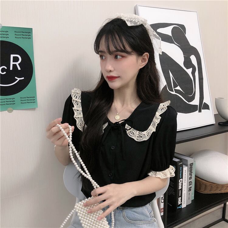 センスニッチレースドールカラーシャツ女性夏新スタイルeign気質バブル半袖ブラックトップ 1号婦人86069039978