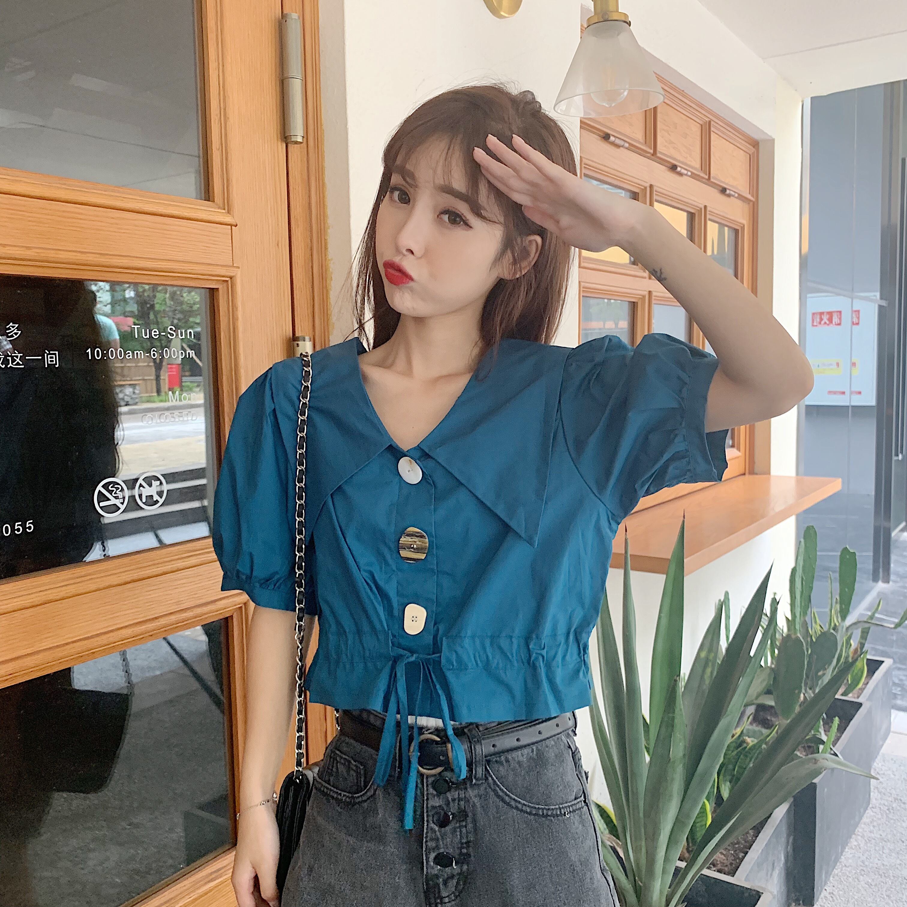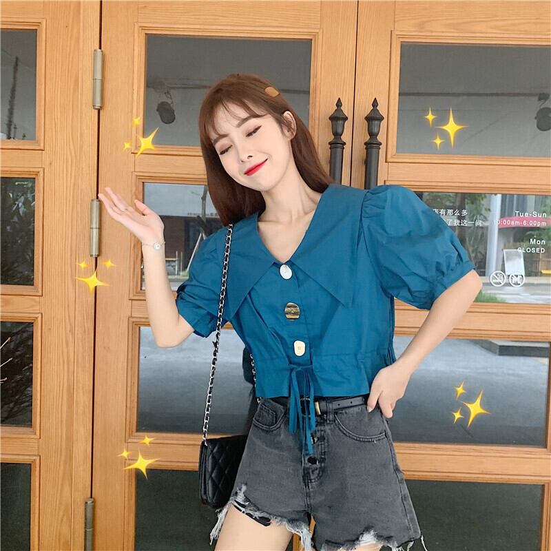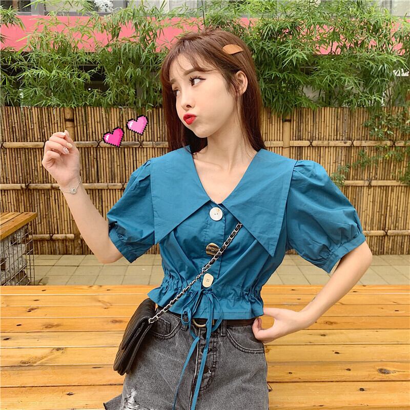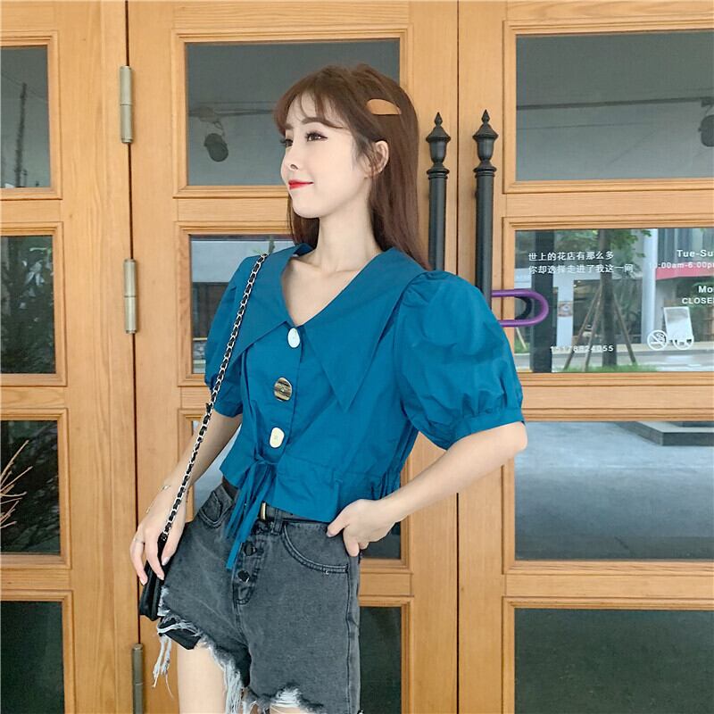 サマーレディースシャツ2020新バージョンのビッグラペル巾着オールマッチウエストパフスリーブショートシャツシャツ 1号婦人94684098087
