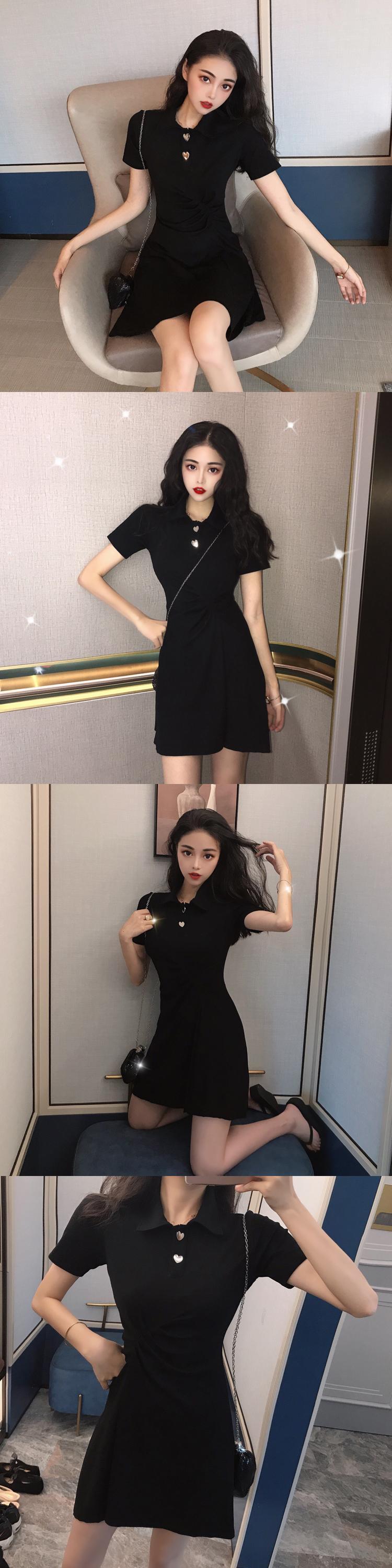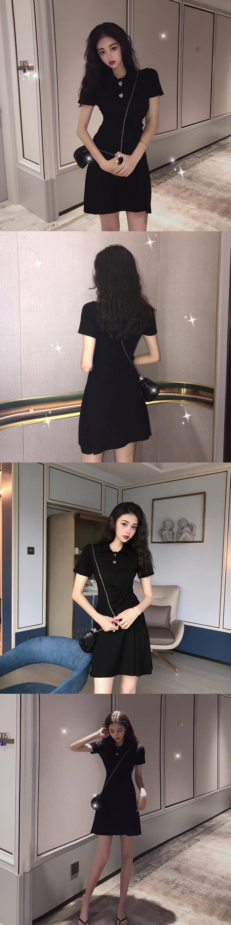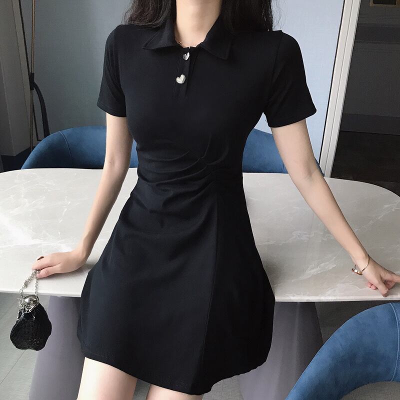 ポロカラー半袖ドレス女性2020年新夏ウエストスリミングAラインスカートスリムリトルブラックドレス 1号婦人96496946350