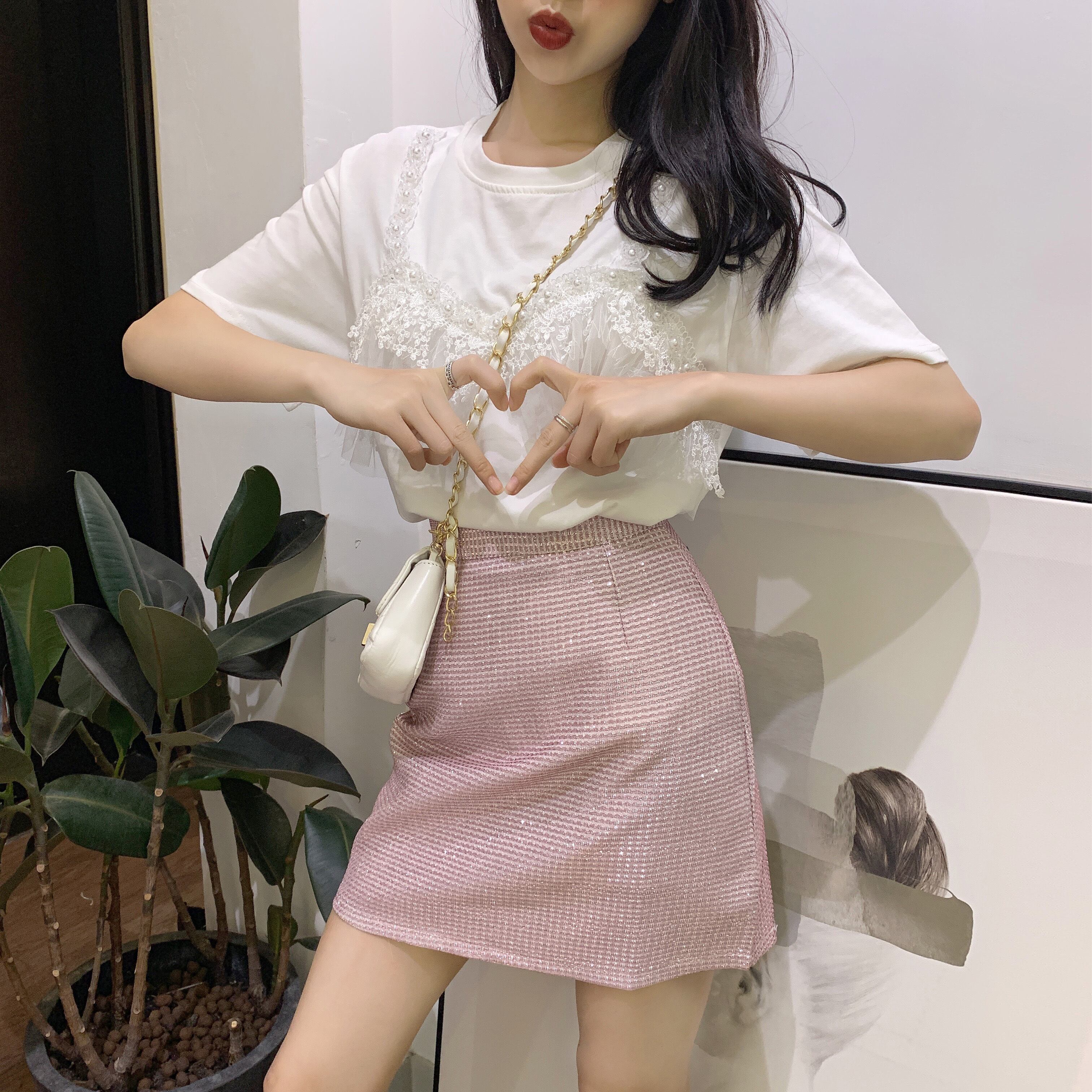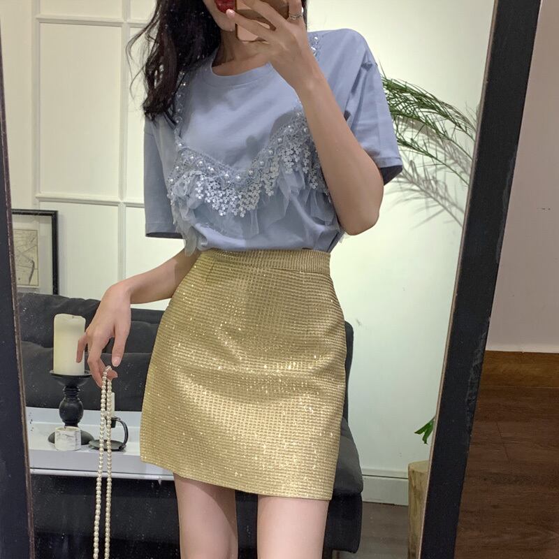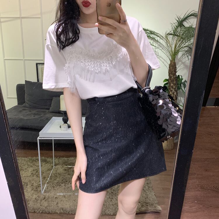 半袖2020新しいルーズネットレッドTシャツ女性インスーパーファッションレースステッチフェイクツーピースカジュアルトップ 1号婦人29467815597