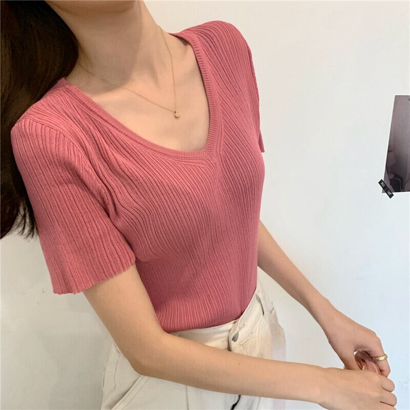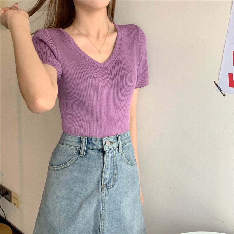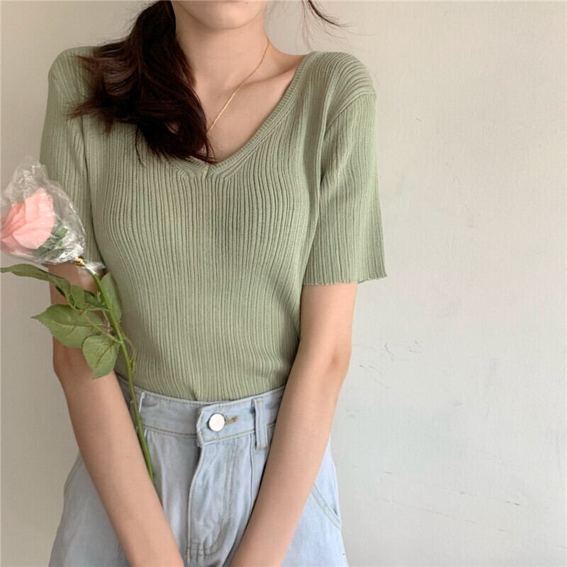 2020年夏のシンプルなピュアカラーのベーシックなワイルドな自家栽培Vネック半袖セーターアウタートップの新しい女性バージョン 1号婦人97246228390